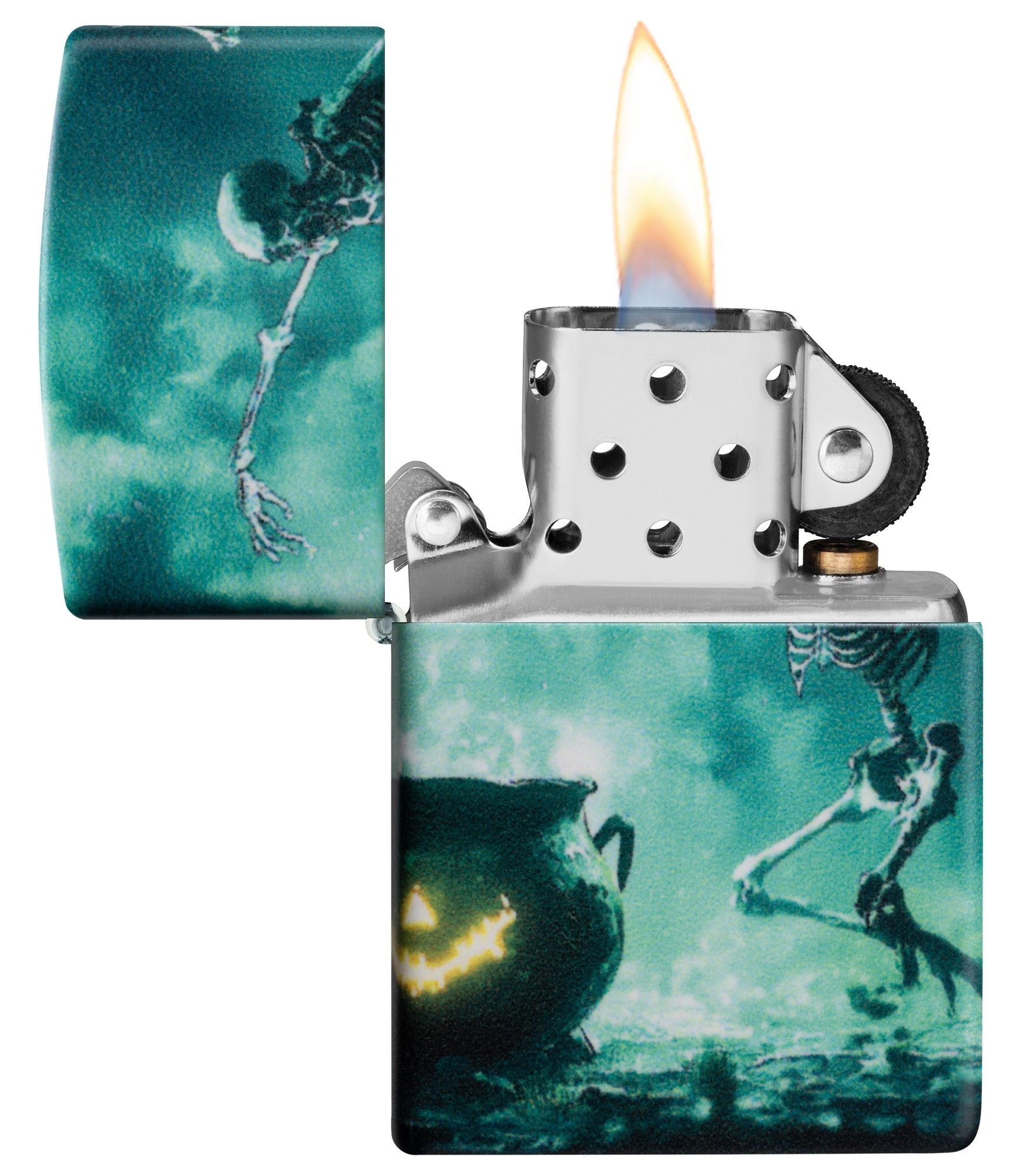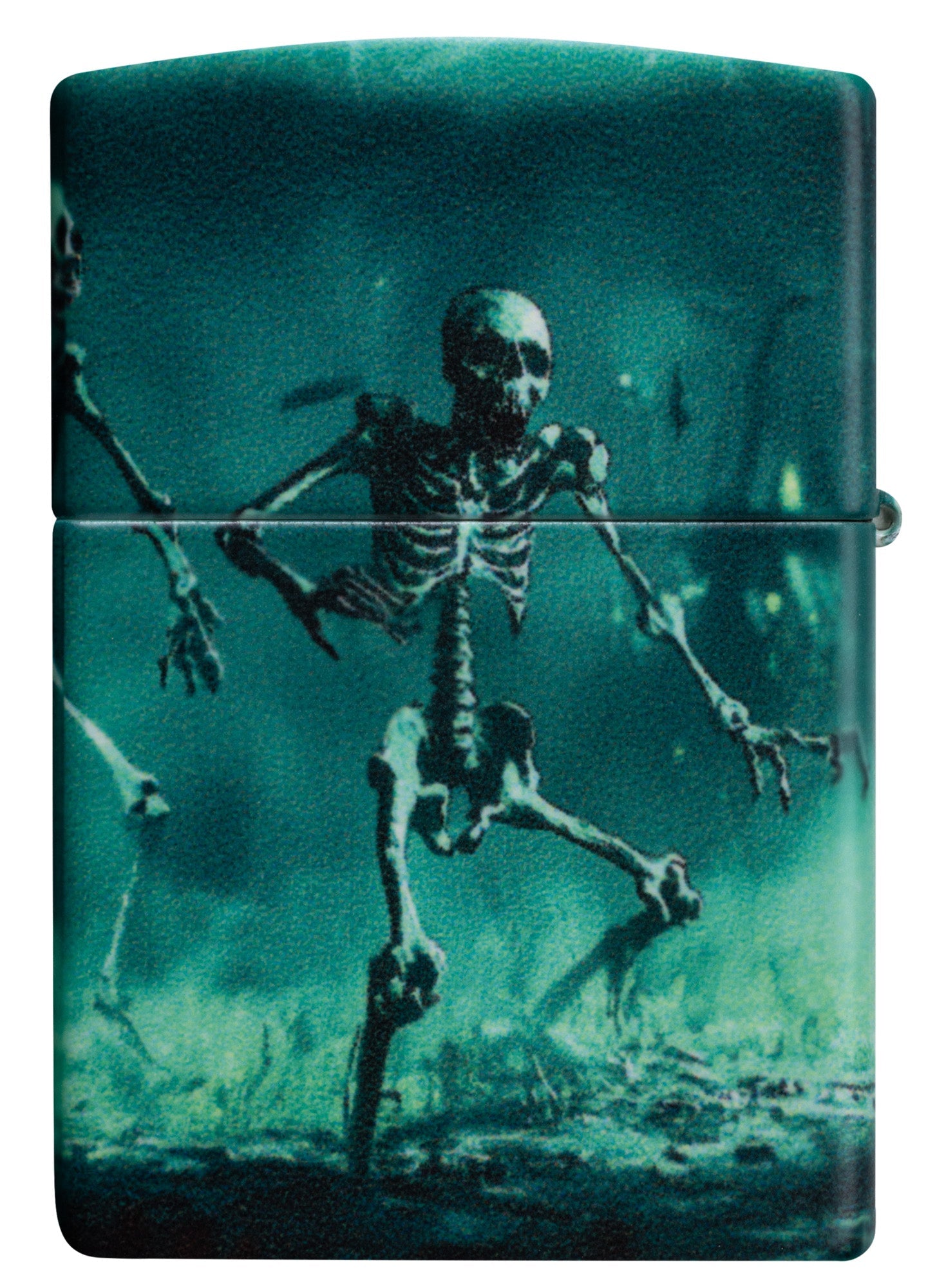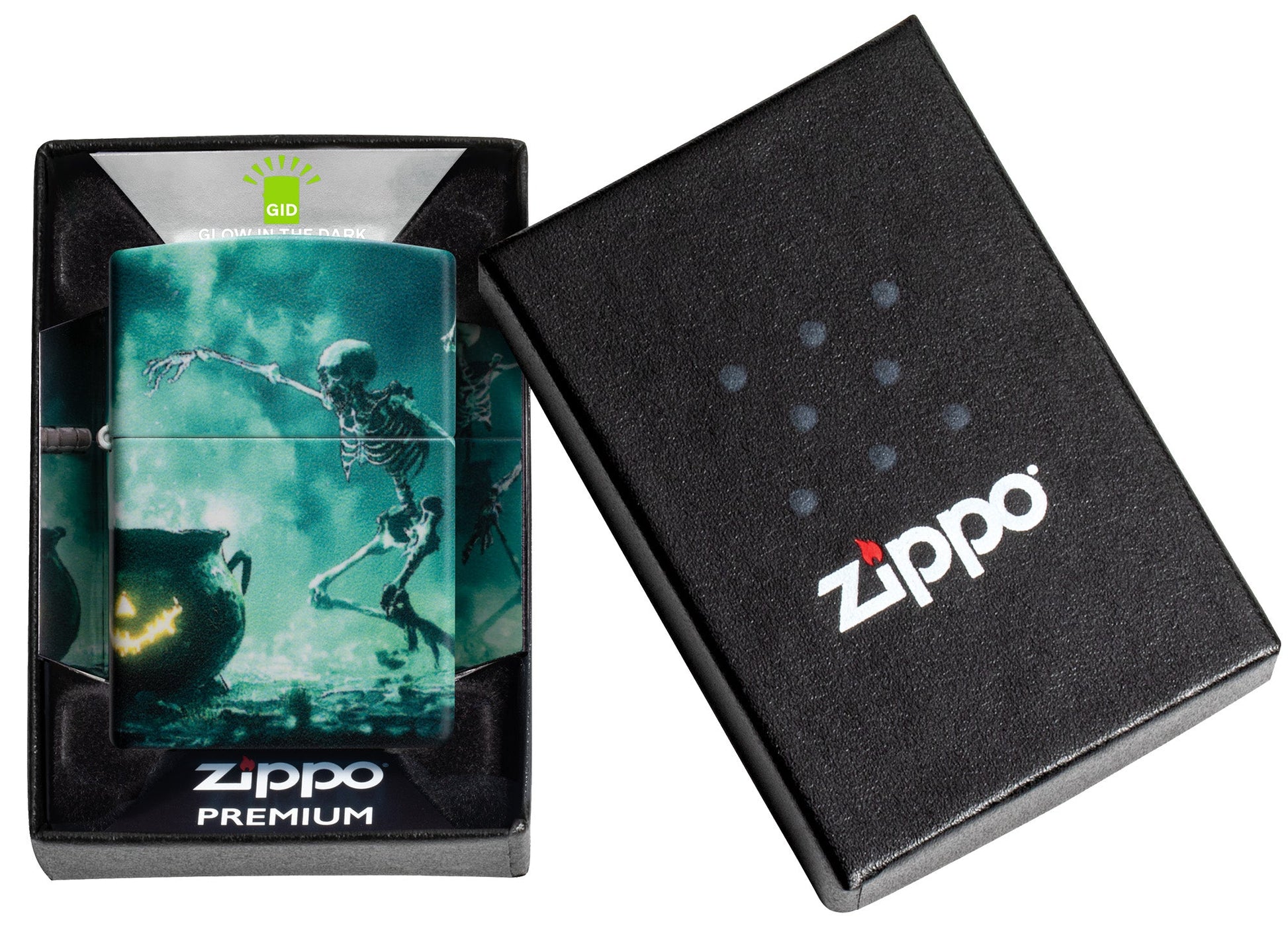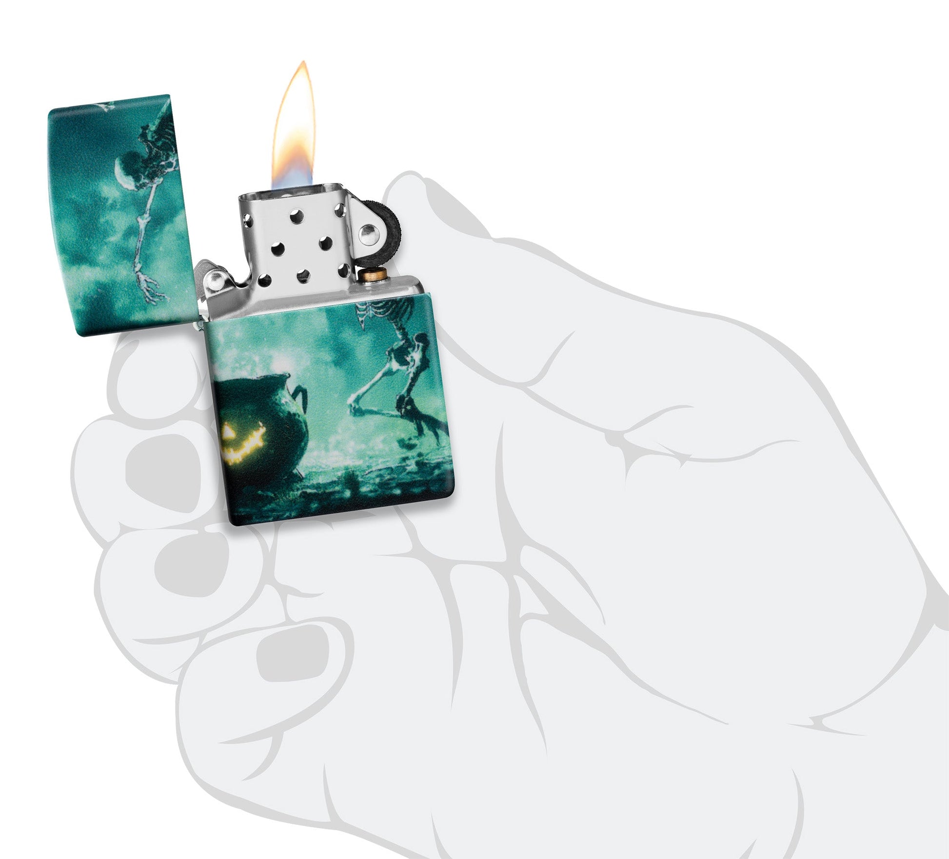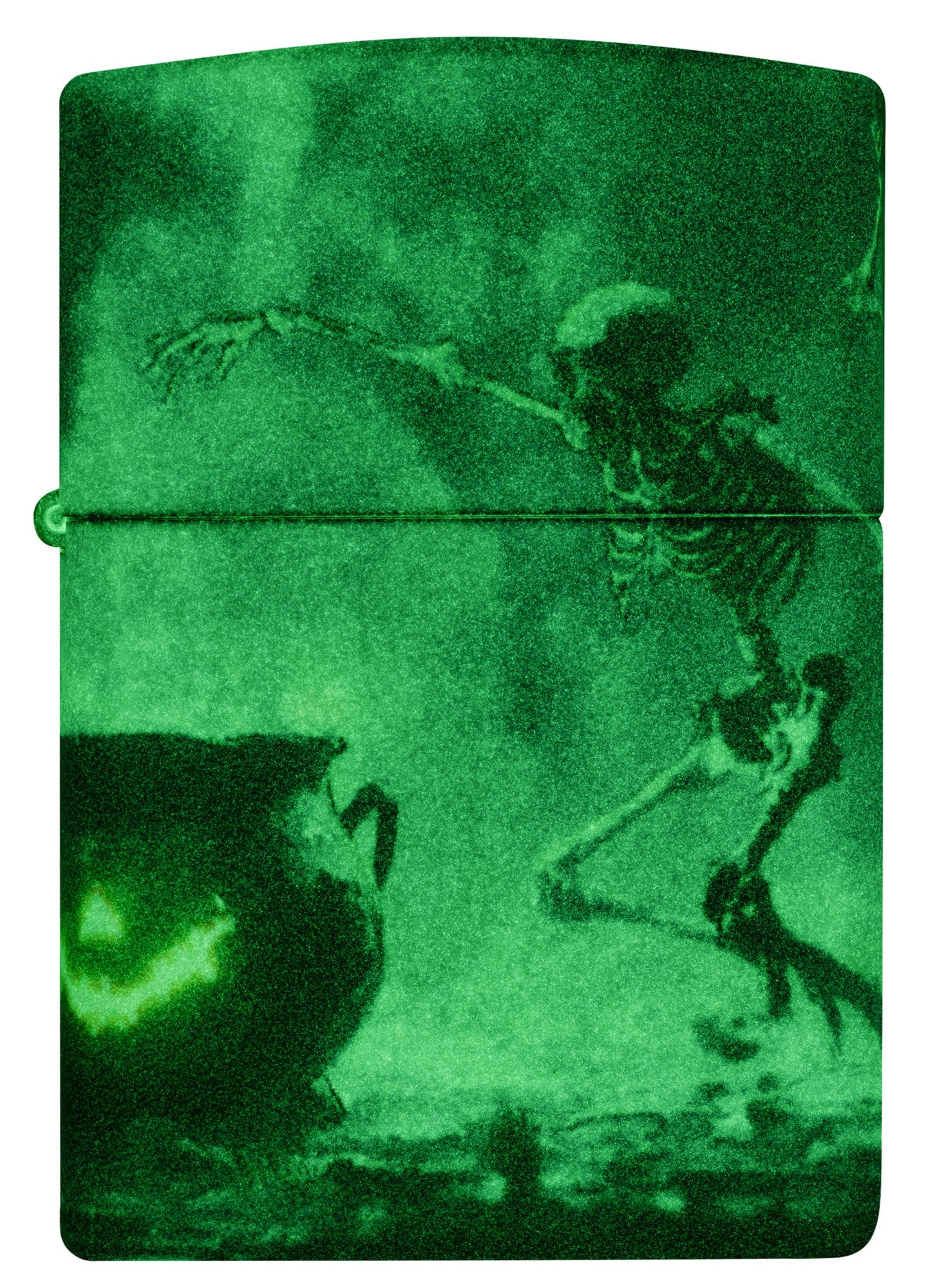 Een groep skeletten danst rond een borrelende ketel op deze klassieke 540 Color-aansteker met een verrukkelijk griezelig ontwerp dat voor extra aantrekkingskracht met onze speciale Glow-in-the-Dark-afwerking behandeld is.