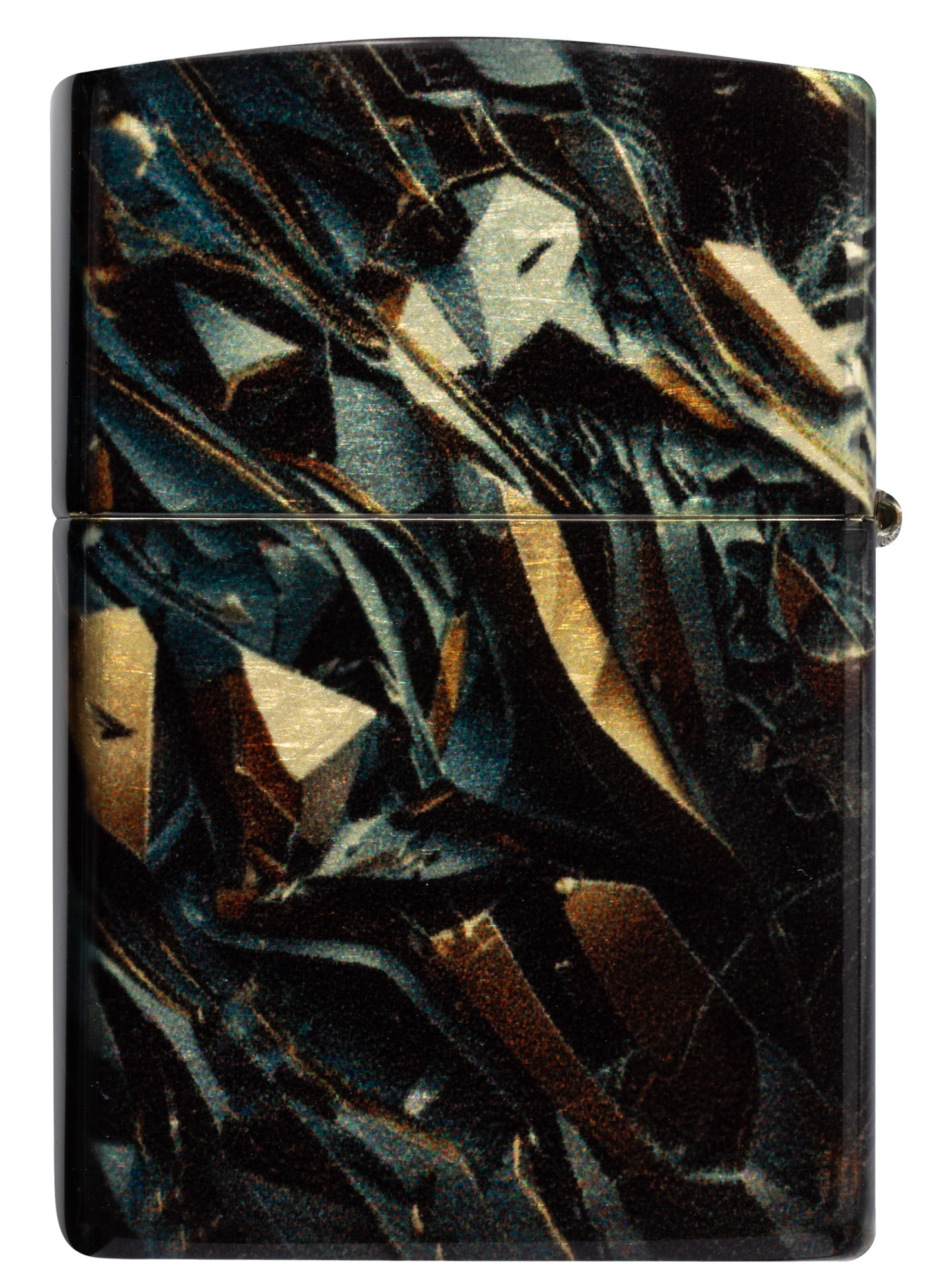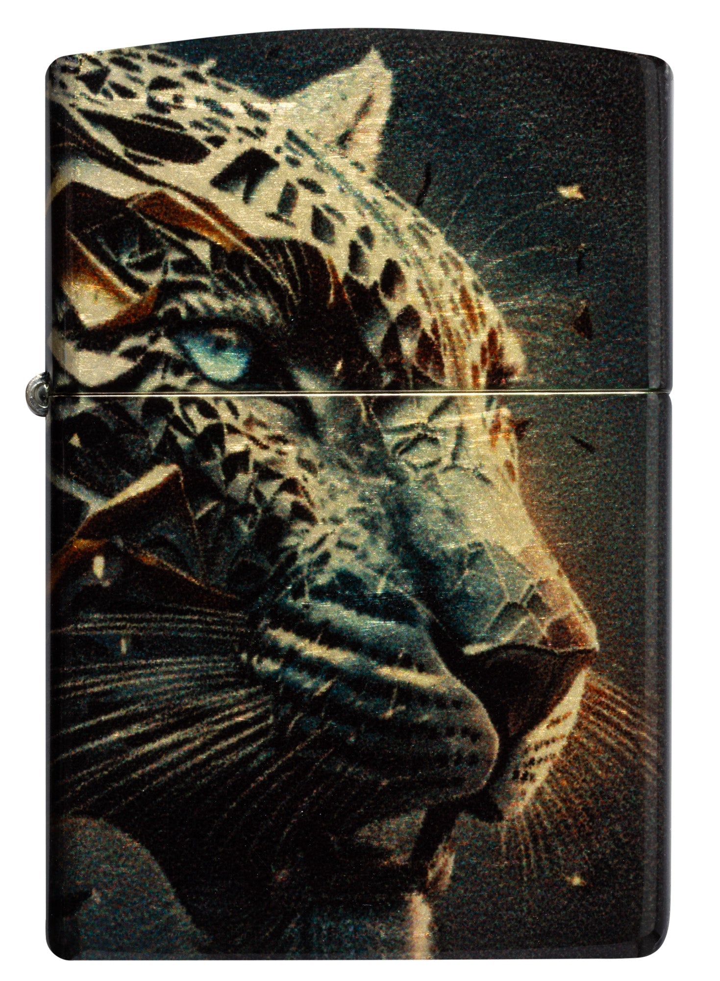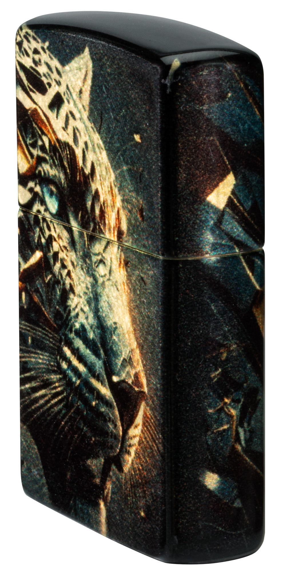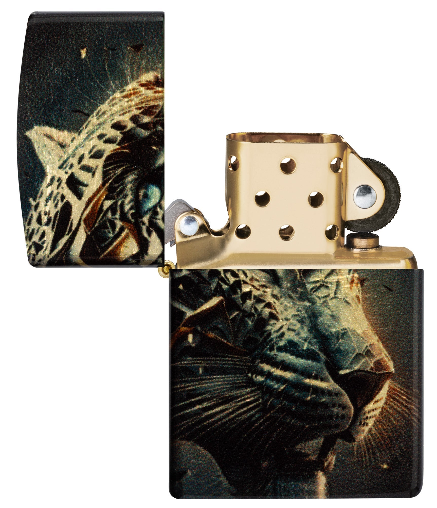 Glinsterende scherven van gedraaid metaal komen samen en vormen een krachtig uitziende panterkop op deze klassieke aansteker van getrommeld messing met een oogverblindend 540° Fusion-ontwerp.
