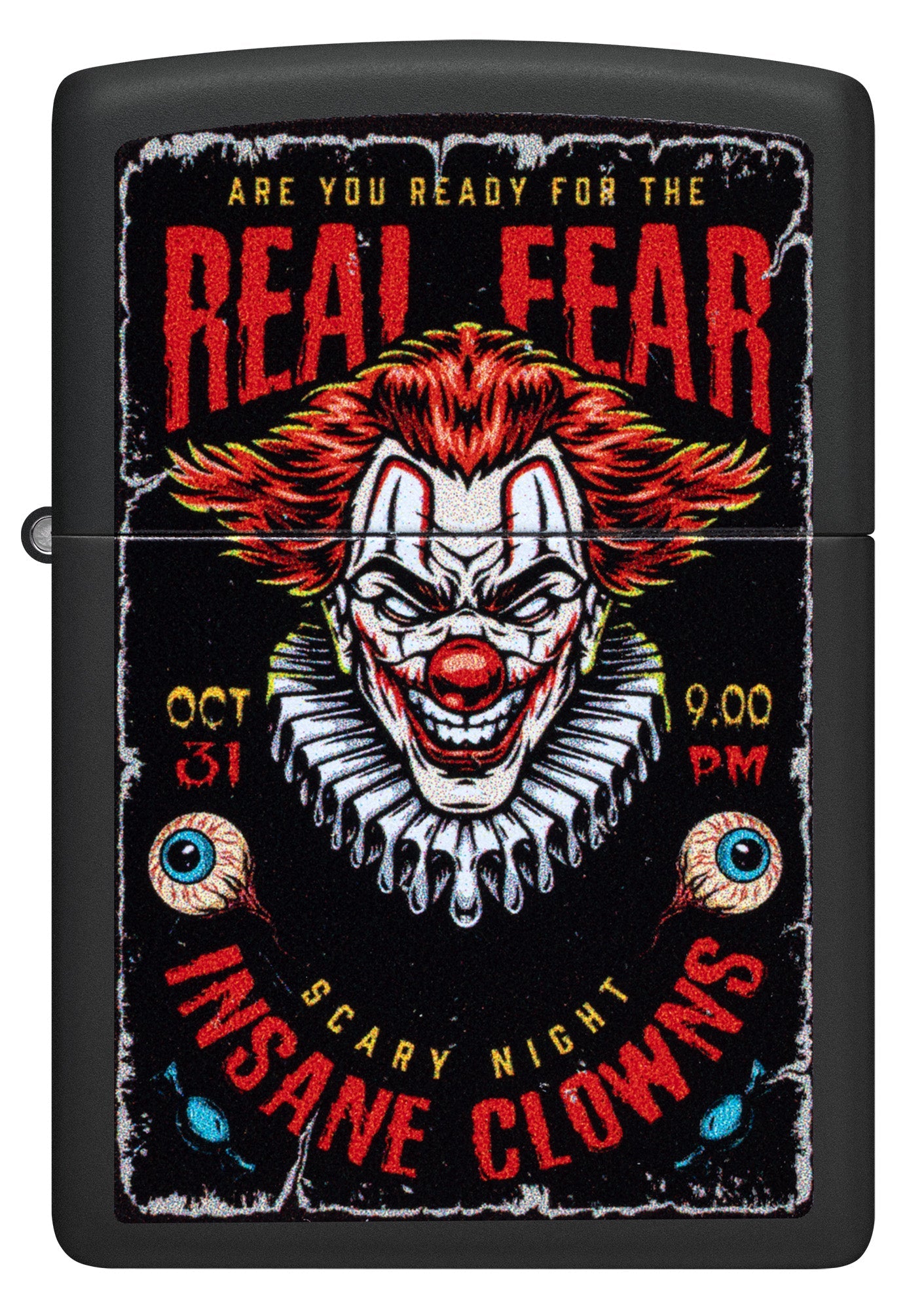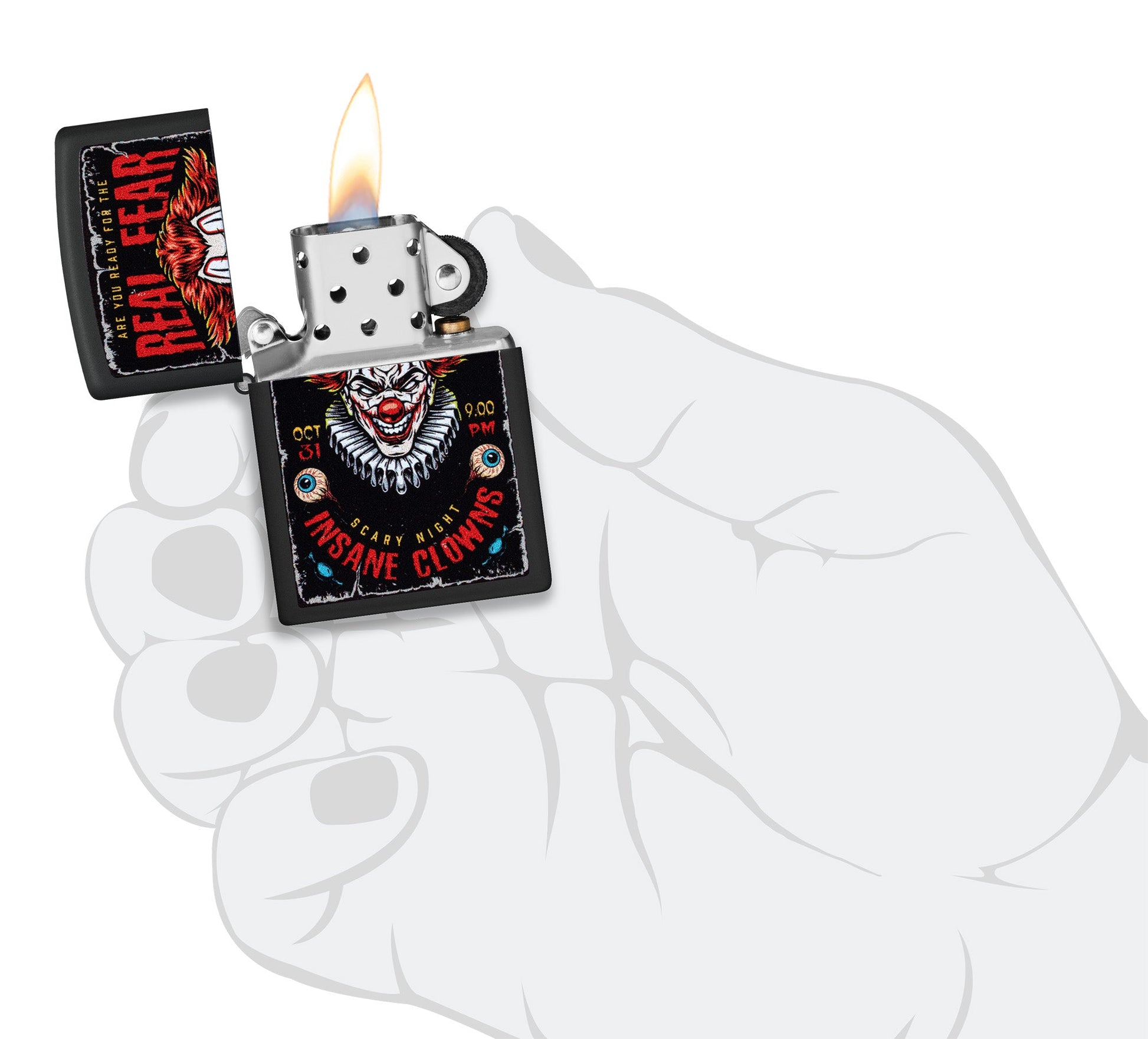 De spanning en sensatie van Halloween leven voort met deze klassieke, mat-zwarte aansteker. Het spookachtige ontwerp doet denken aan een vintage poster met een angstaanjagende clown.