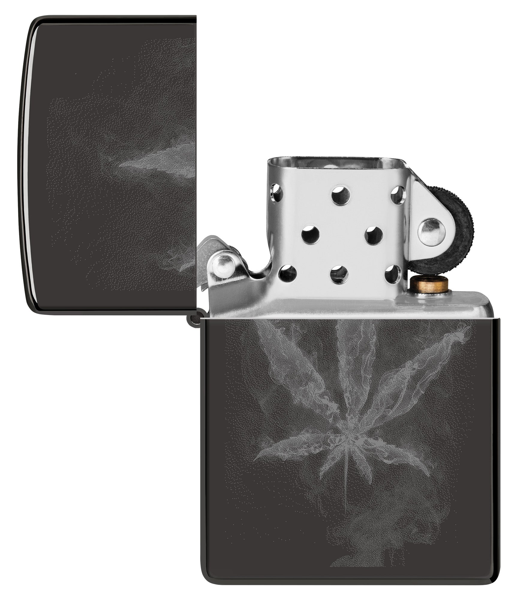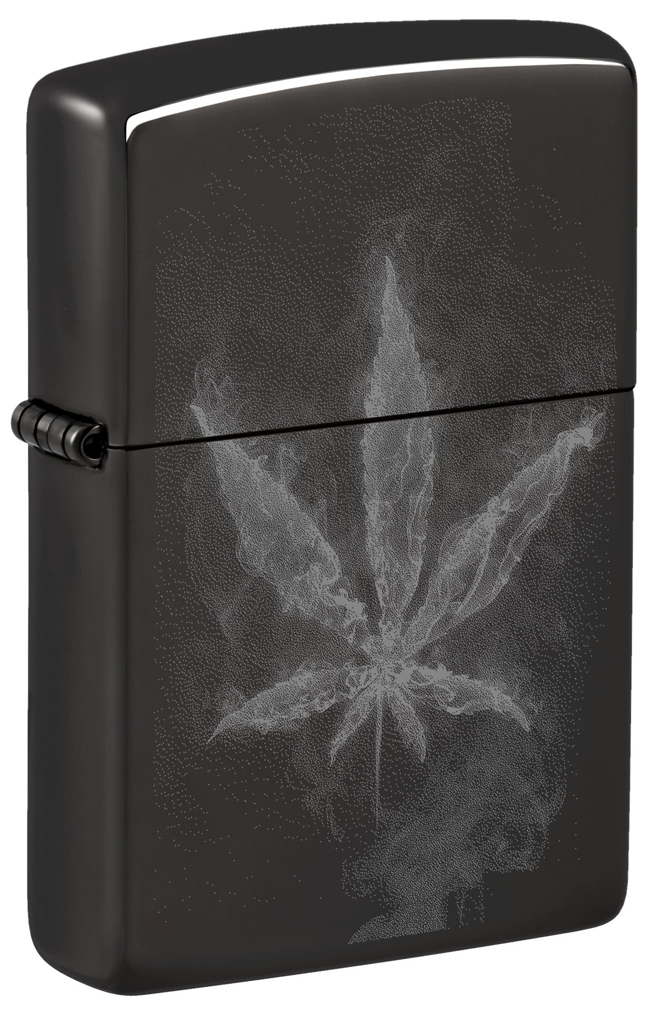 Een delicaat cannabisblad ontvouwt zich op deze klassieke aansteker in hoogglans zwart in een rokerige en subtiele foto-afbeelding.