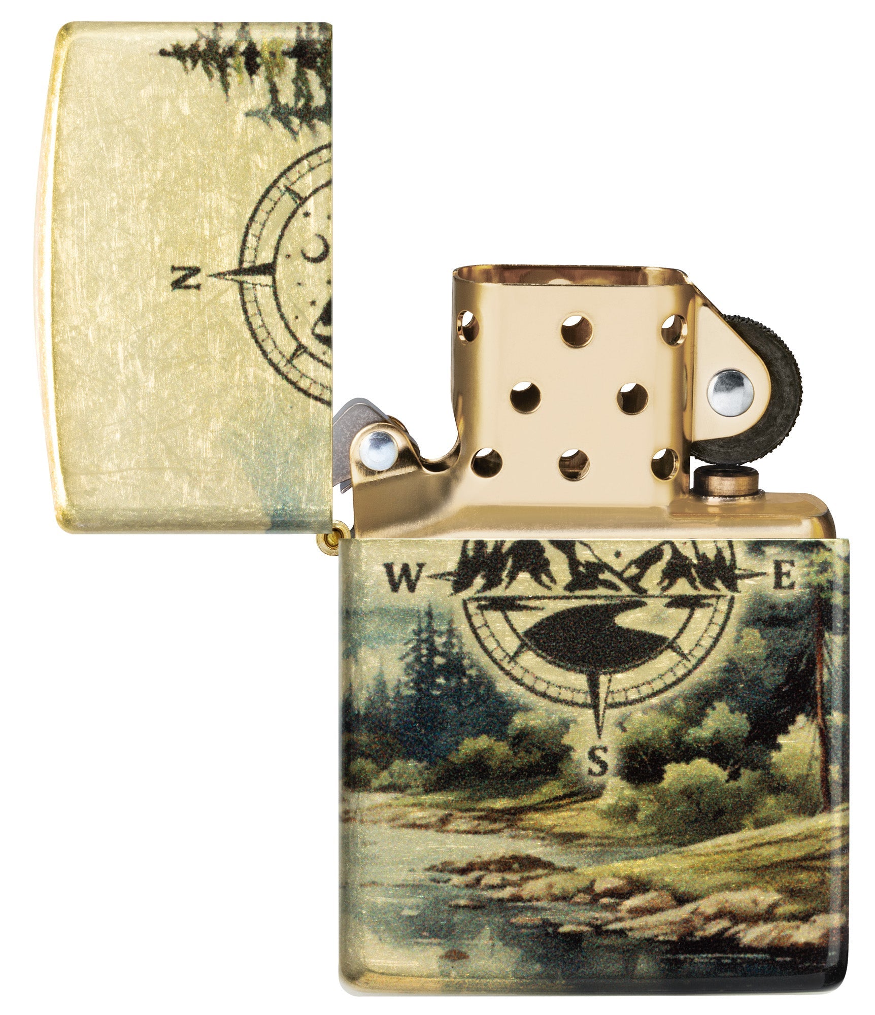 De bergen lonken en deze klassieke aansteker van geborsteld messing is klaar voor het avontuur. Een dromerig boslandschap strekt zich uit rond alle zijden van de aansteker in een glinsterend 540 Fusion-ontwerp, met in het midden een eenvoudig kompas om je de weg te wijzen.