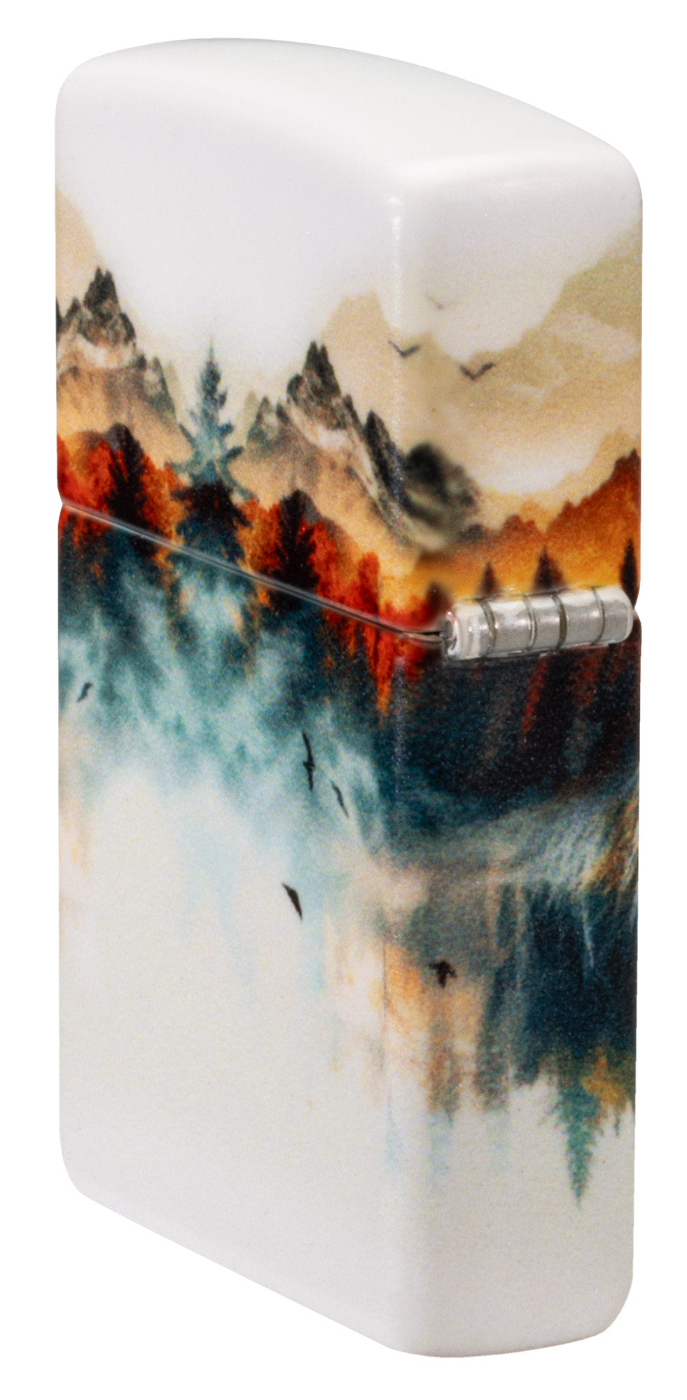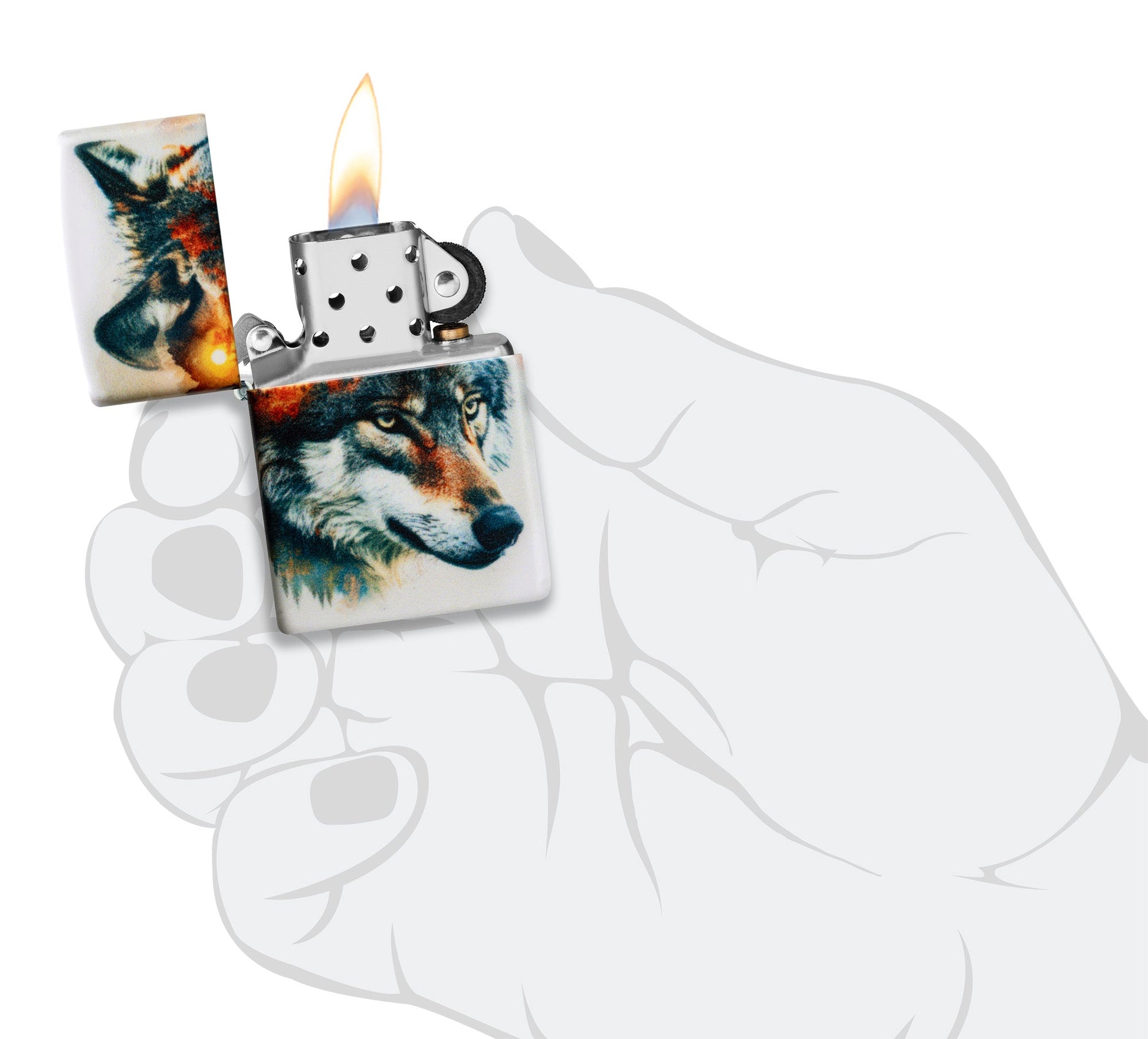 Een krachtig uitziende wolf torent hoog uit boven een schitterend landschap, dat zich uitstrekt rond alle zijden van deze klassieke 540 Color aansteker in een kleurrijk, naadloos ontwerp.