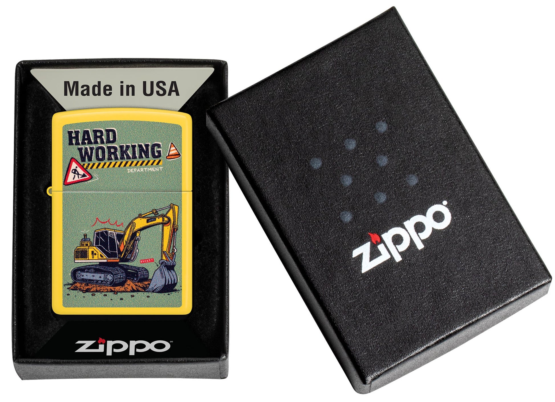 Deze klassieke Sunflower-aansteker is perfect voor liefhebbers of gebruikers van zware machines en toont onder de inscriptie “Hard Working Department” een trilgraafmachine in een gedurfd kleurenpalet.