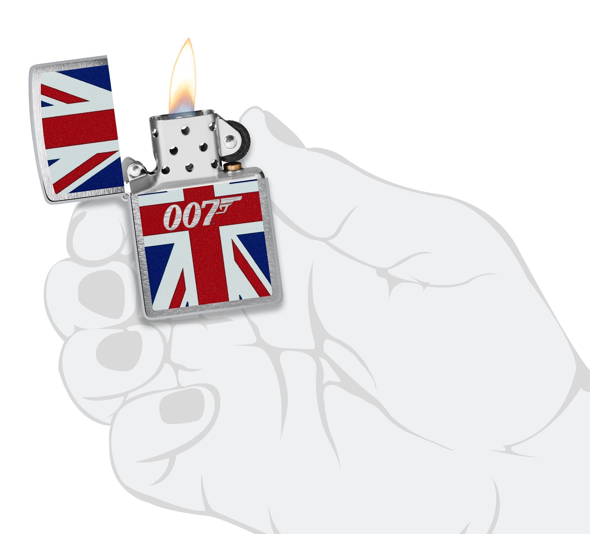 Het iconische 007™-logo domineert het oppervlak van deze klassieke aansteker van geborsteld chroom boven een kleurenafbeelding van de Union Jack-vlag. Het logo komt tevoorschijn door de afwerking van de aansteker onder het ontwerp, wat voor extra diepte zorgt.
