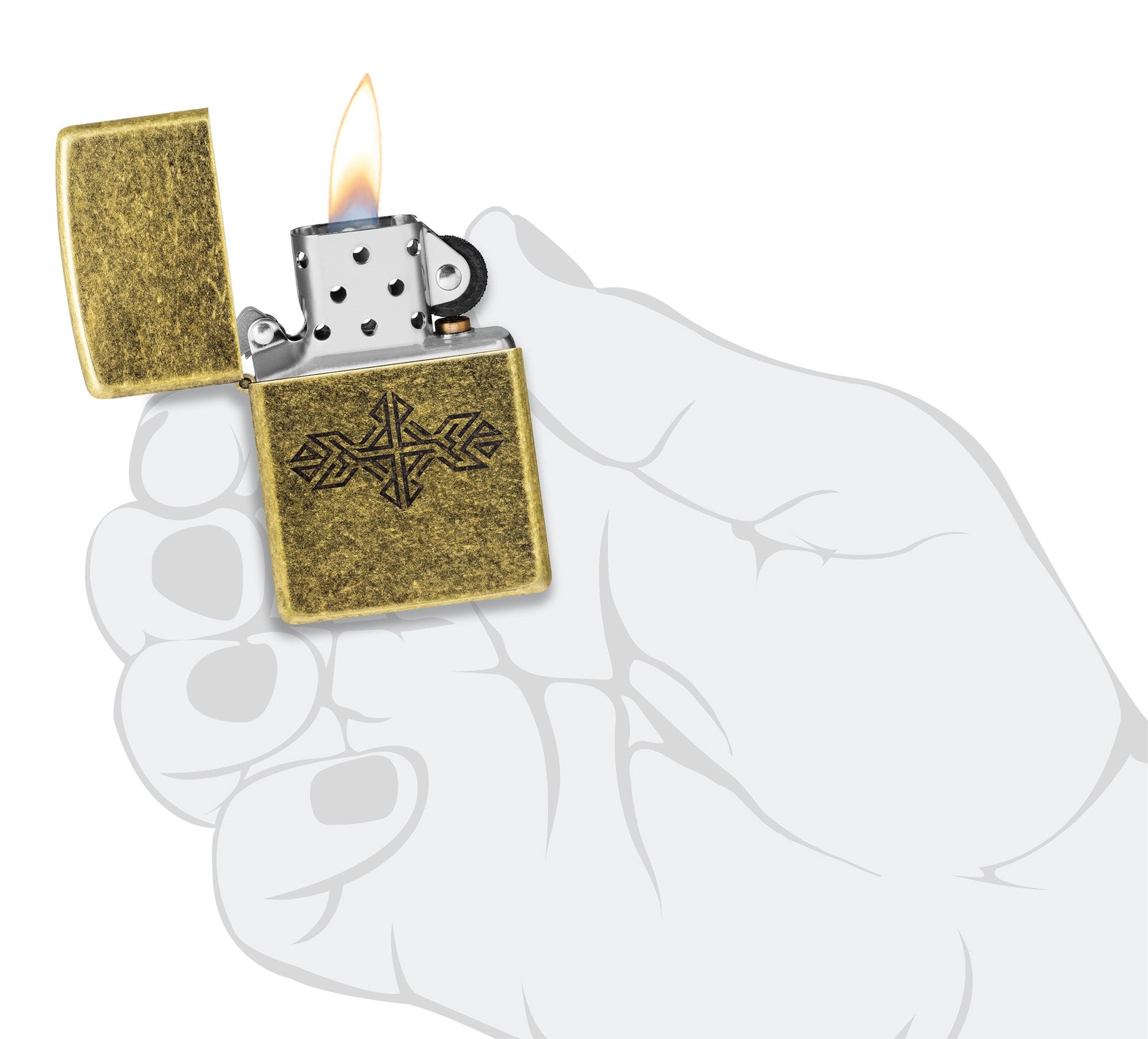 Deze klassieke aansteker van antiek messing is geïnspireerd op oude Noorse runen en is geëtst met een eenvoudig middeleeuws symbool in een subtiel glansontwerp.