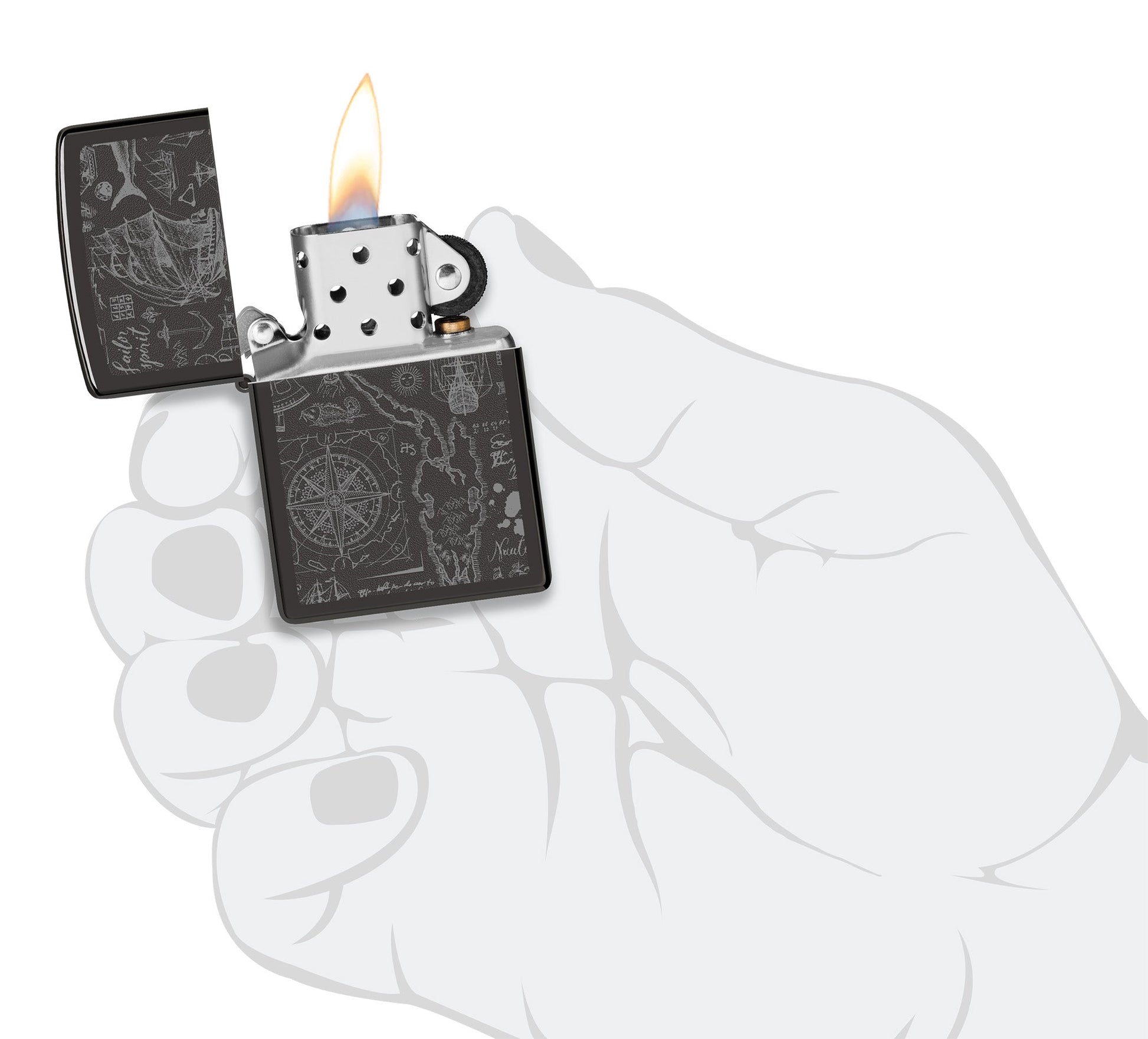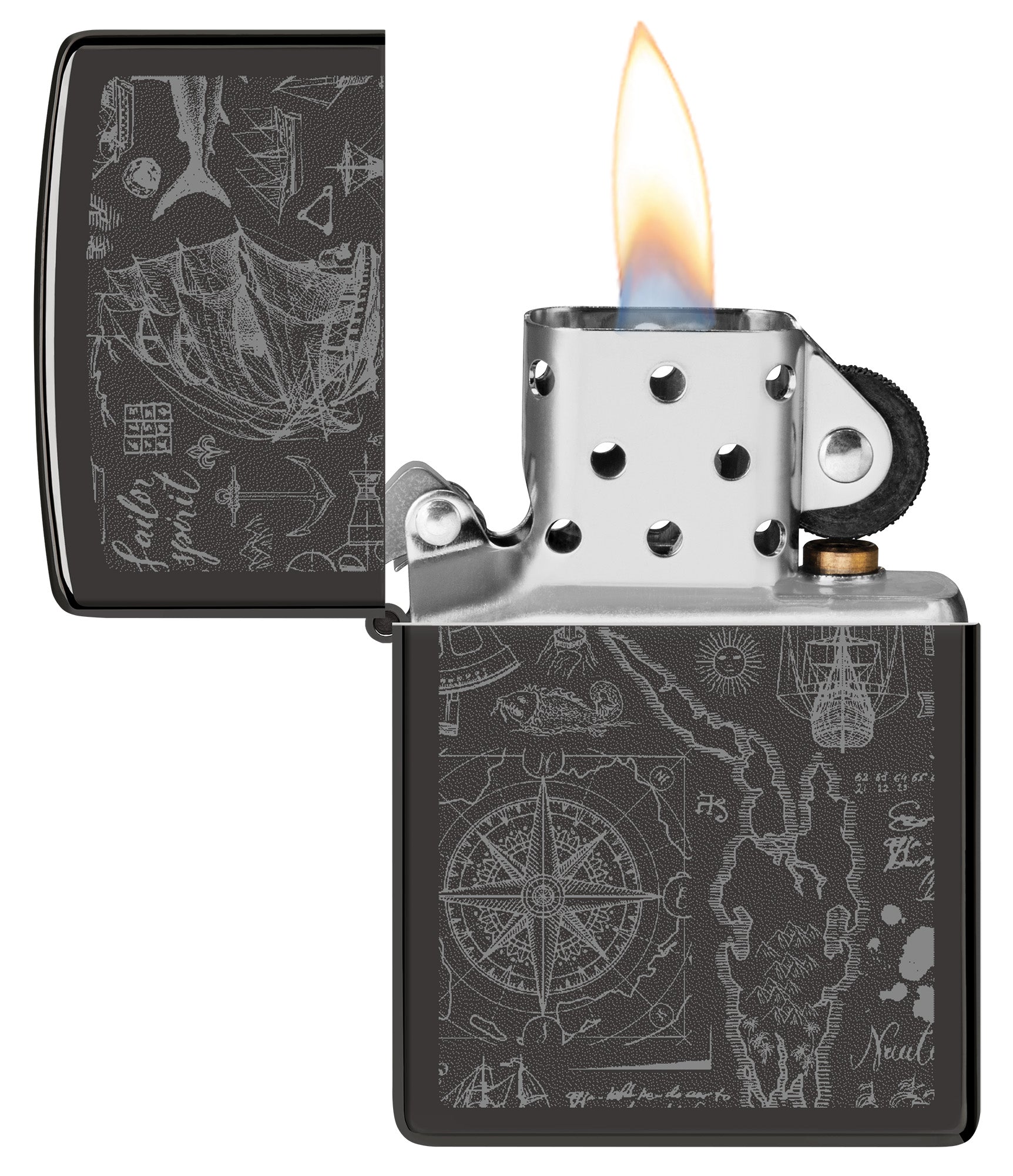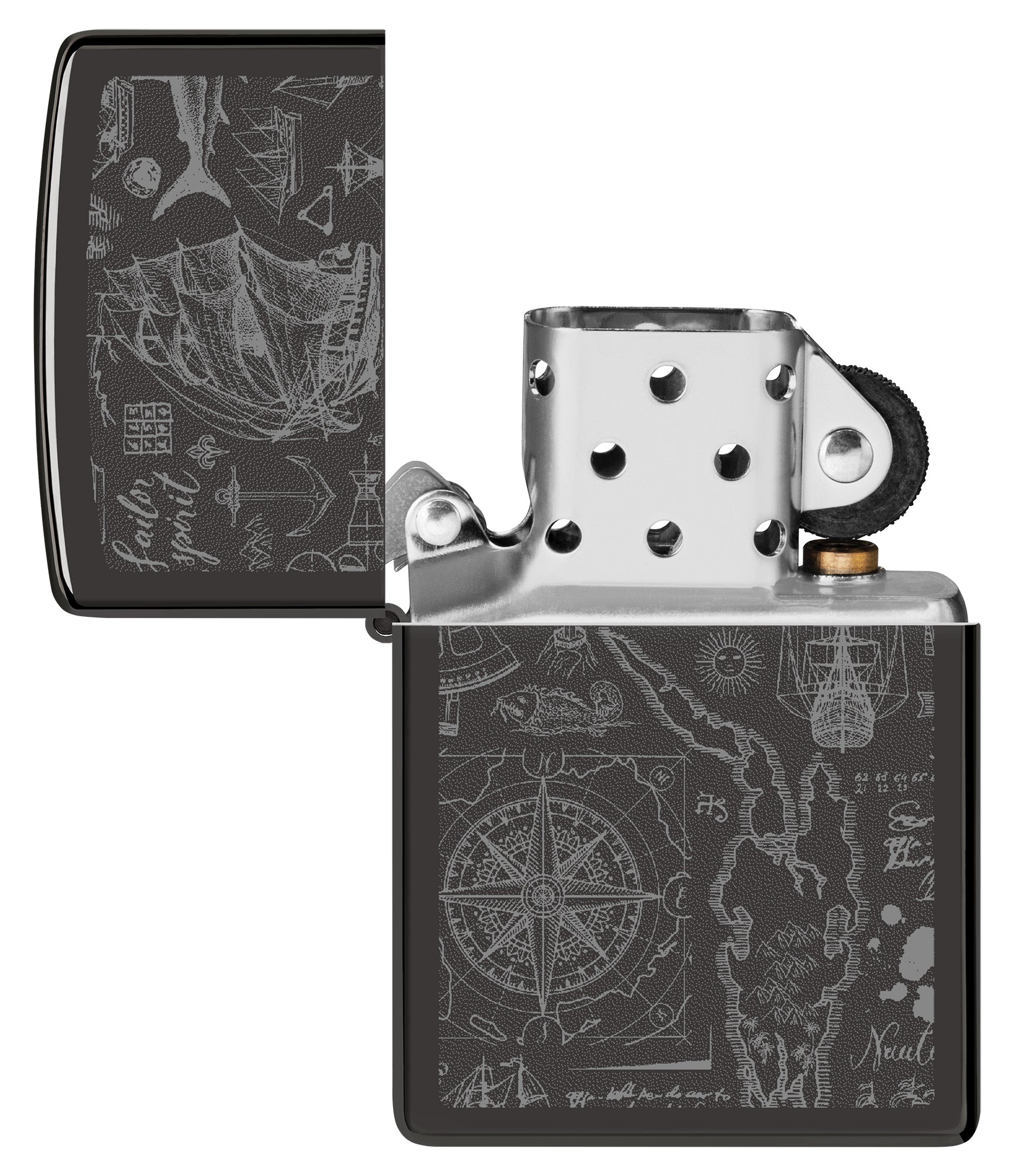 Bevaar de zeven zeeën met deze klassieke aansteker in hoogglanzend zwart. Schepen, kompassen, kaarten en andere nautische elementen vullen het oppervlak van deze aansteker met subtiele details.