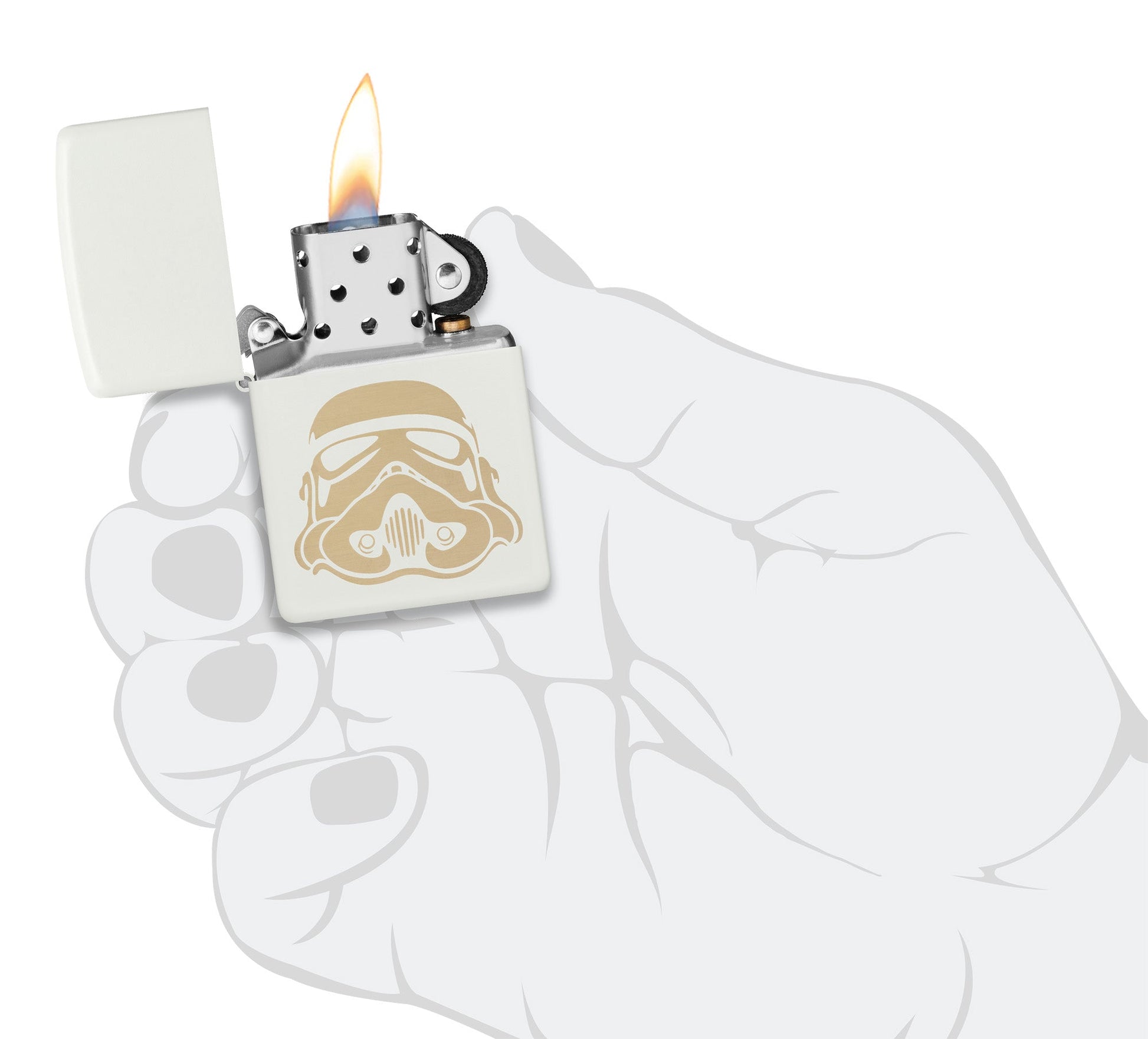 Dit ontwerp van Original Stormtrooper, misschien wel de meest herkenbare strijdmacht in het heelal, komt perfect tot zijn recht op deze klassieke White Matte-aansteker. De iconische Stormtrooper-helm is lasergegraveerd op het oppervlak, waardoor de glanzende messingtinten van de aanstekerbehuizing zichtbaar worden.