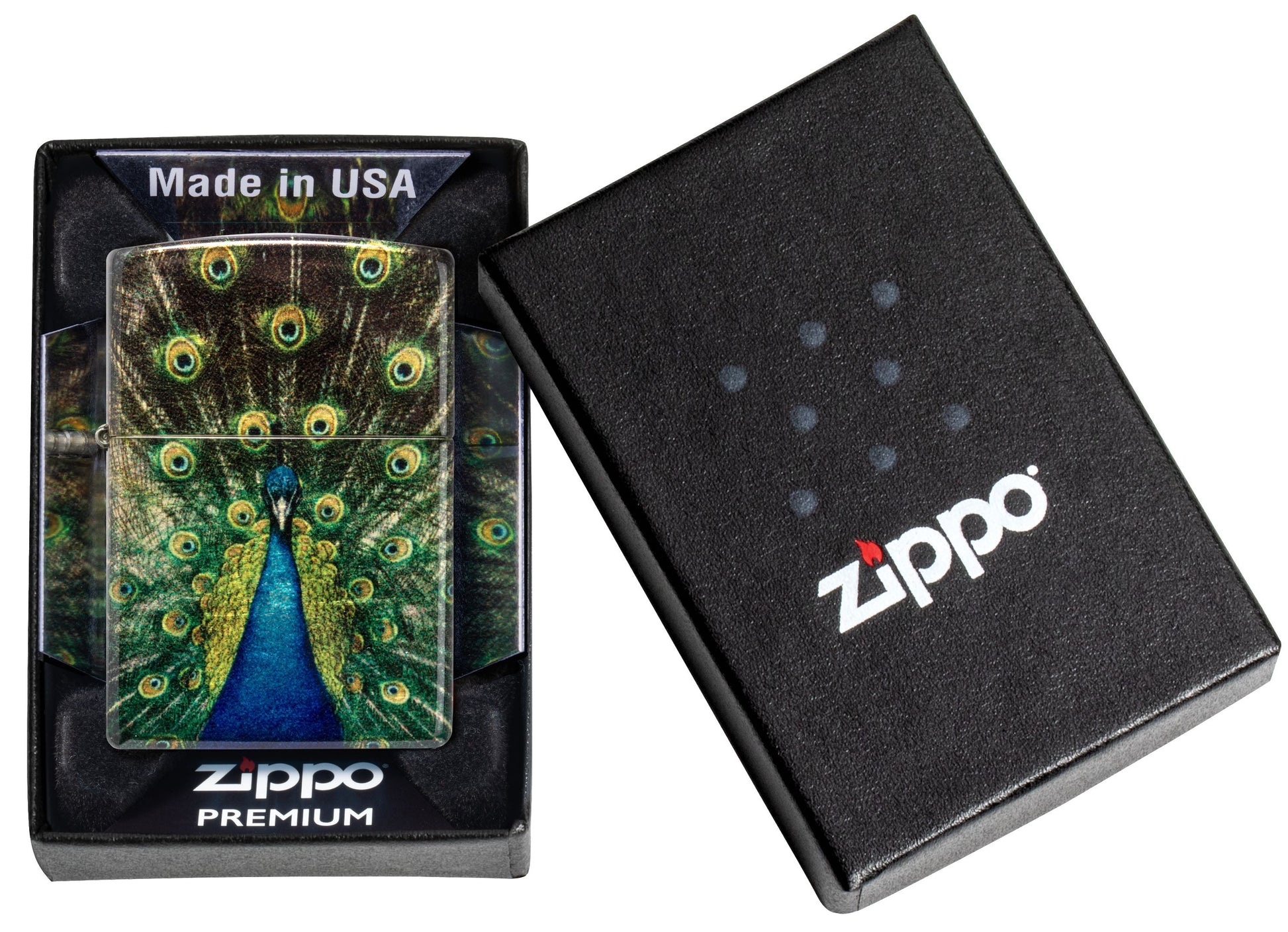 Een prachtige pauw spreidt zijn staartveren rondom deze felgekleurde 540 Color aansteker.