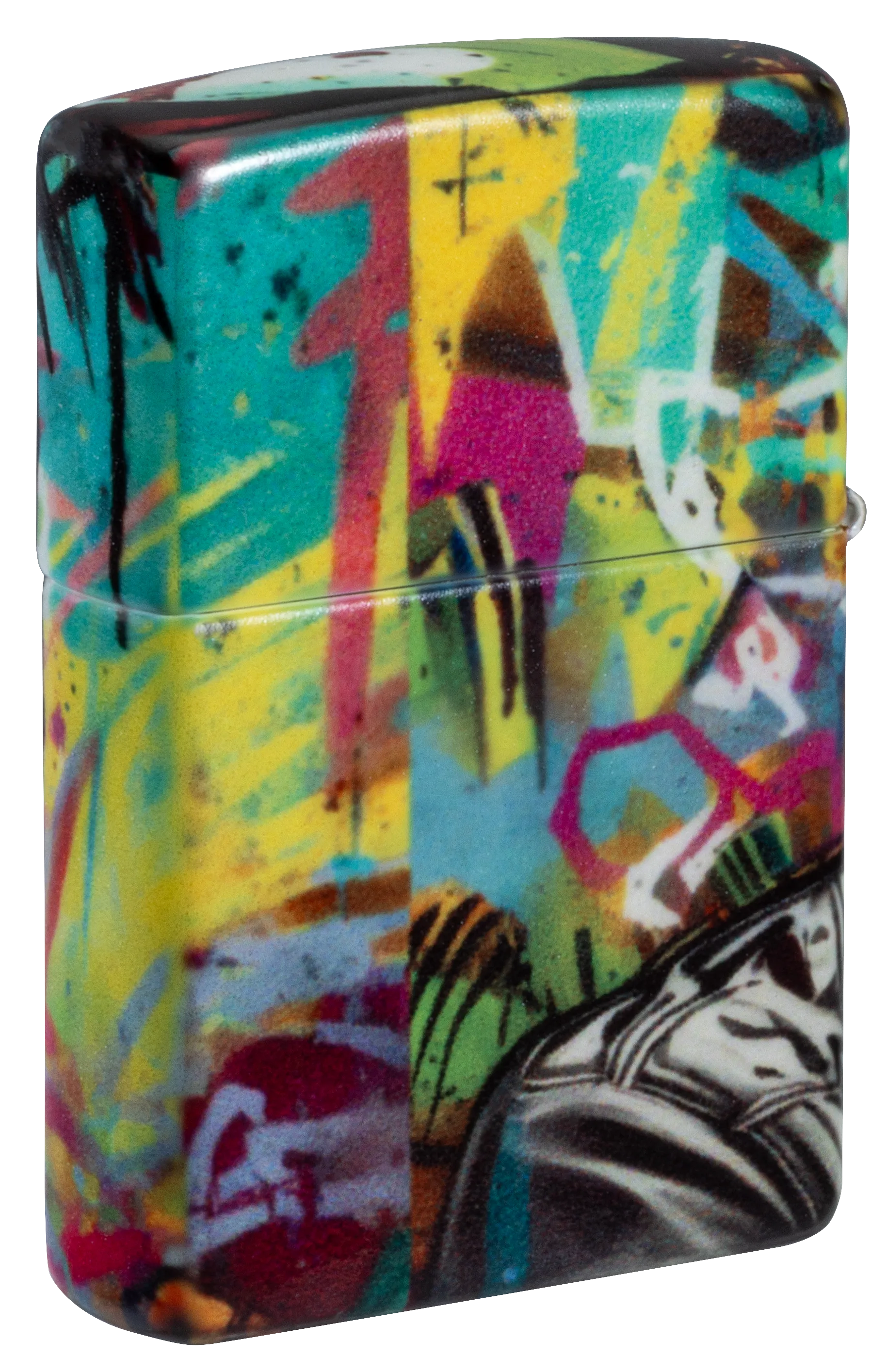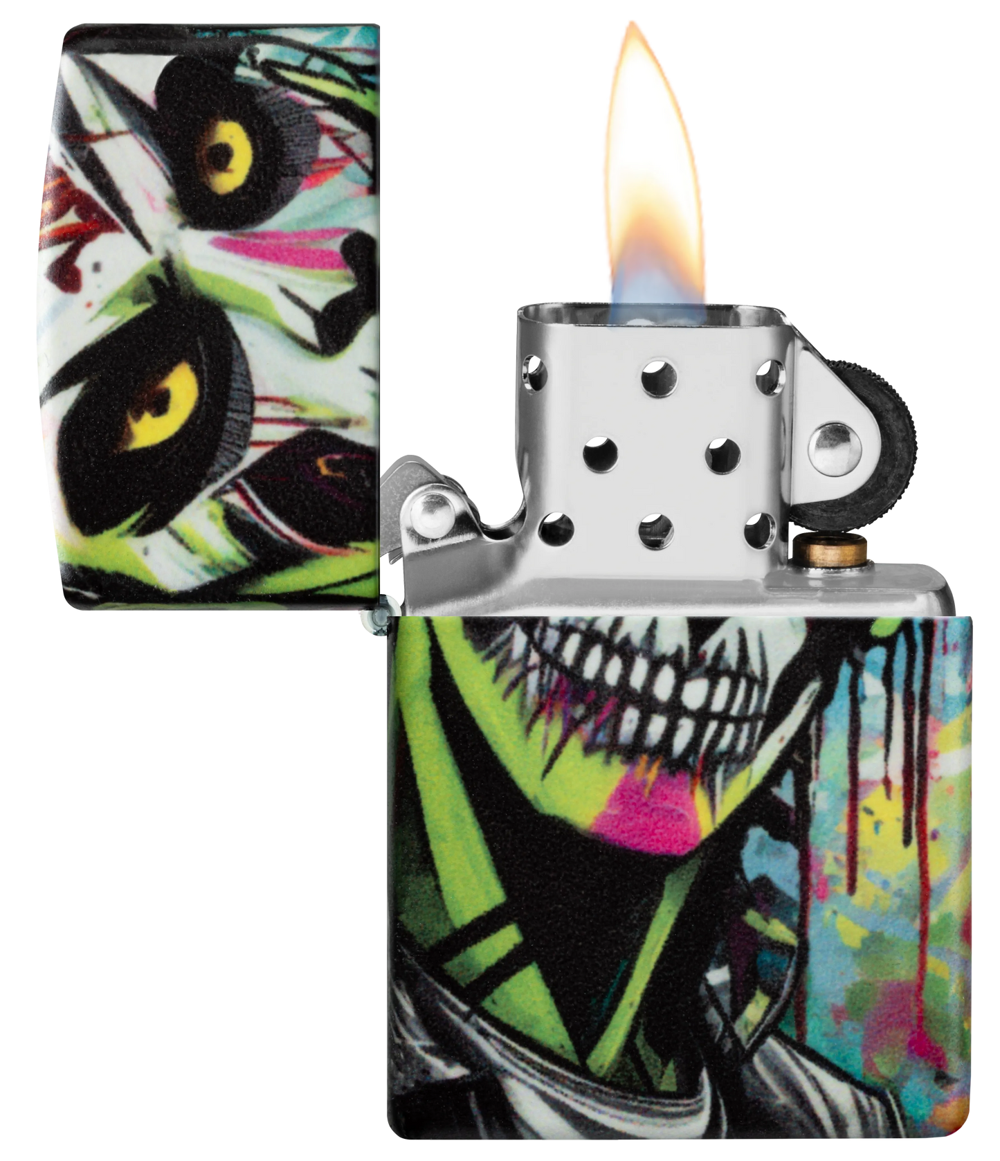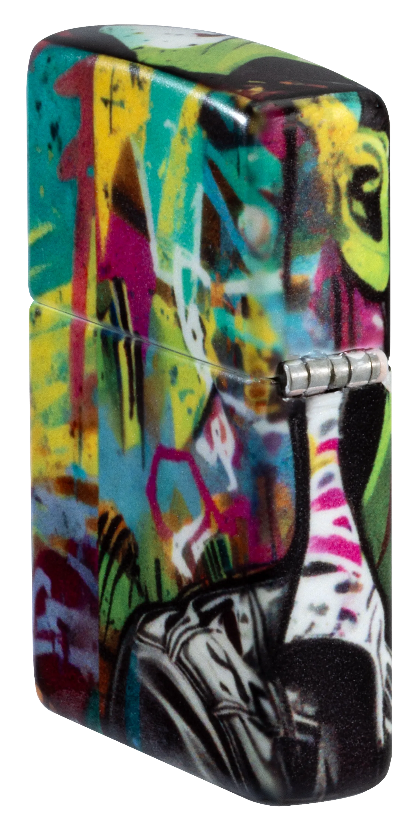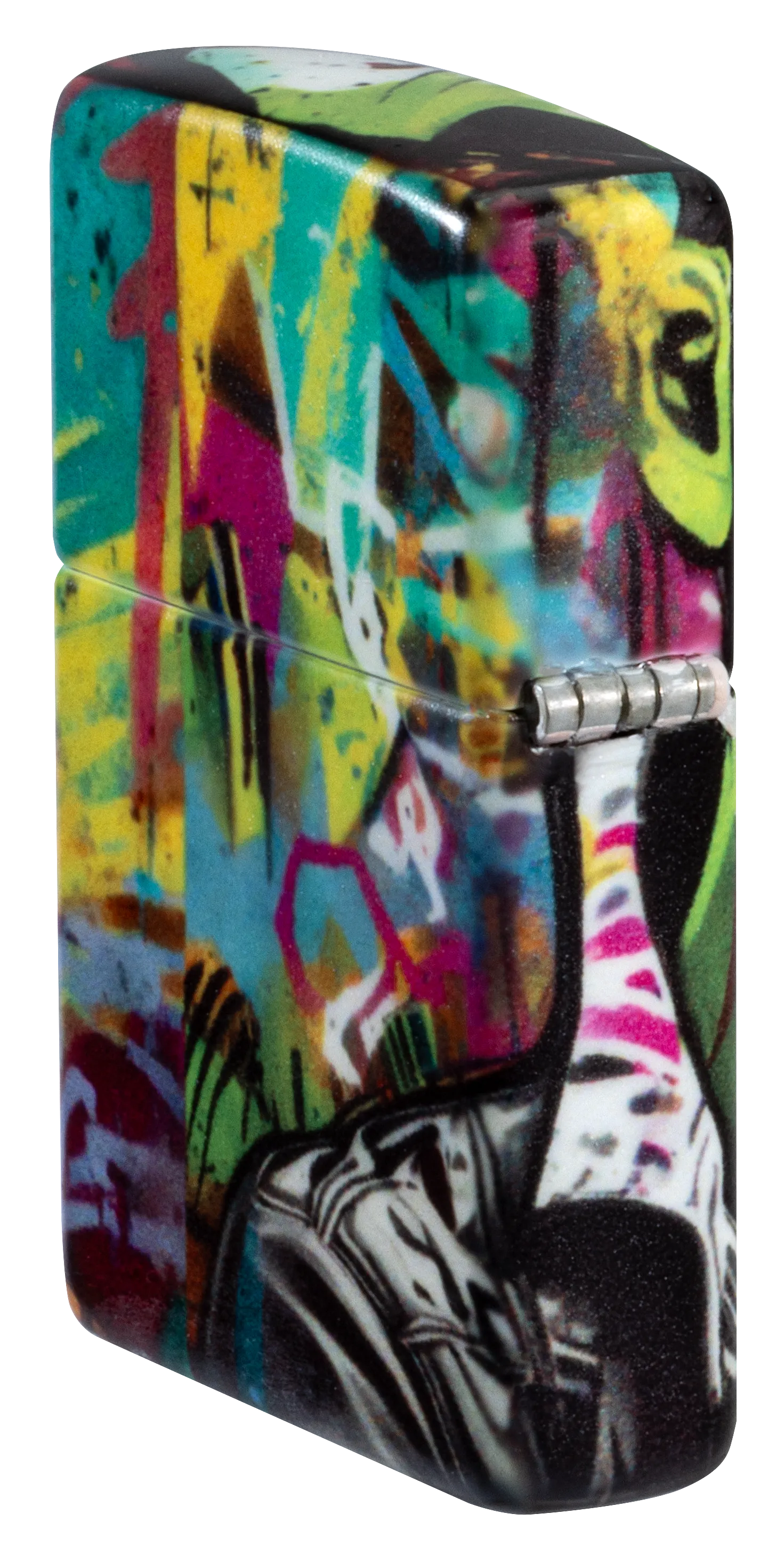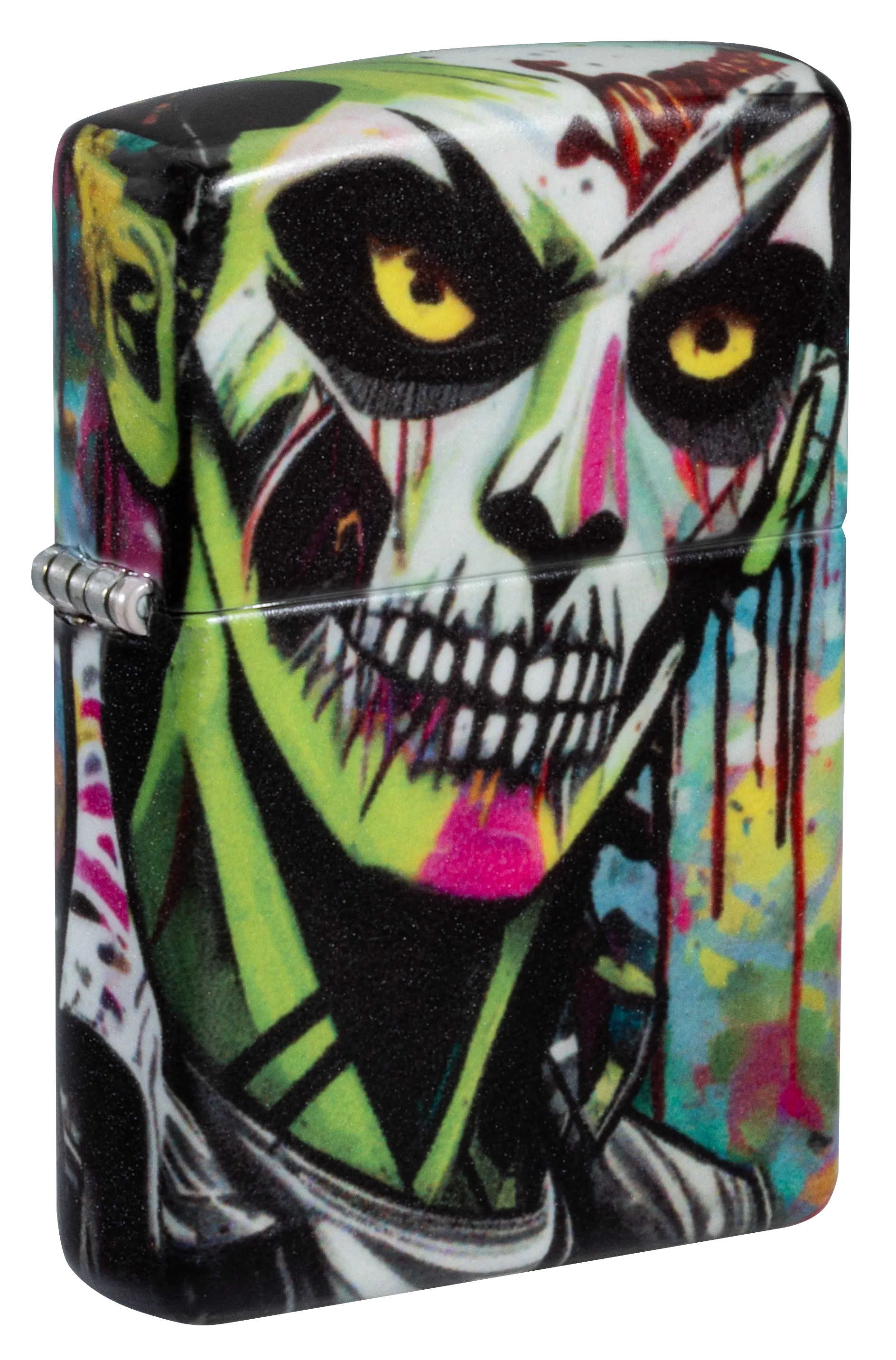 Een zombie, omringt door felle kleurenflitsen, kruipt van het oppervlak van deze klassieke 540 Color aansteker in een graffiti-geïnspireerd ontwerp aan alle kanten.