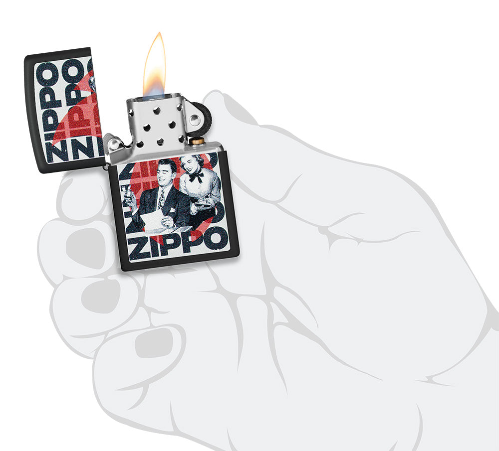 Voeg een vleugje nostalgie aan je collectie toe met deze klassieke Black Matte aansteker. Het woordmerk en het vlamsymbool van Zippo dienen als achtergrond voor een vrolijk paar Zippo-fans in dit heerlijk Color Image retrodesign.