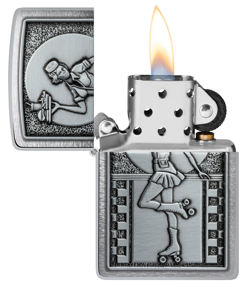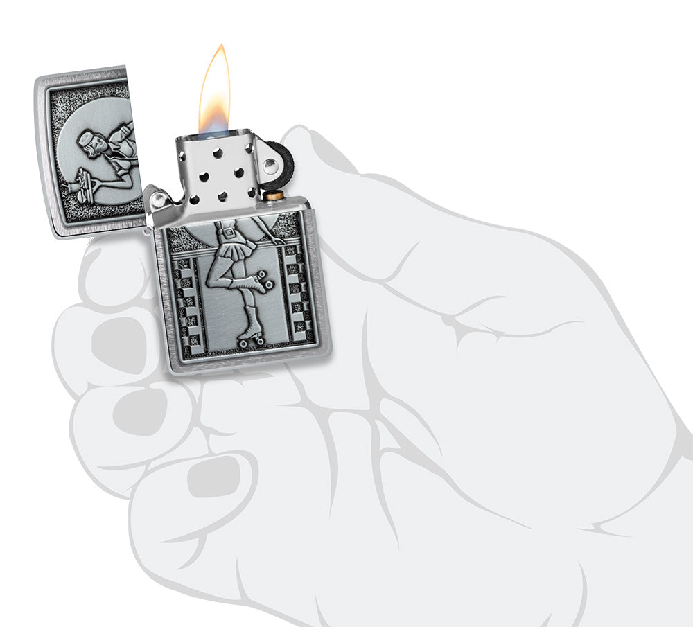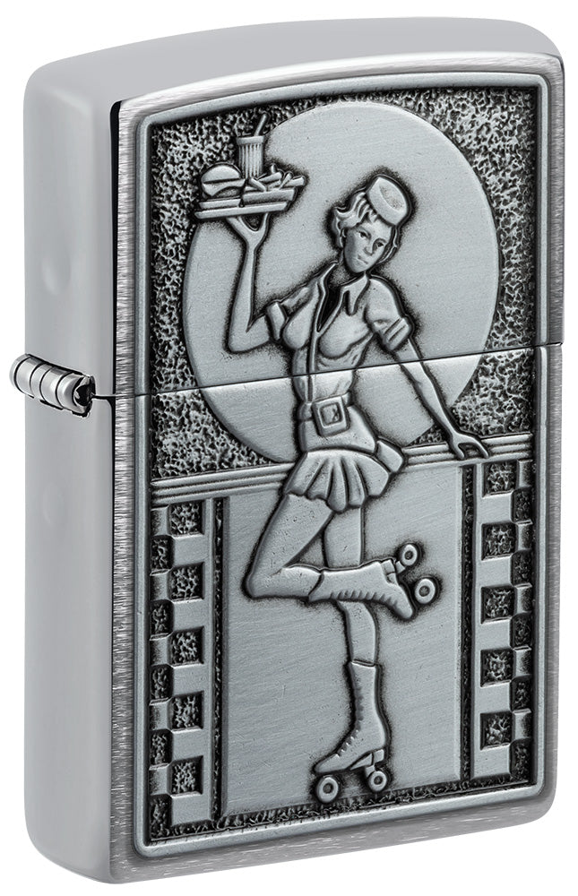 Gedenk je favoriete drive-inrestaurant met deze klassieke Brushed Chrome aansteker. Het verfijnde metalen embleem toont een serveerster op rolschaatsen die heerlijke hamburgers komt brengen.
