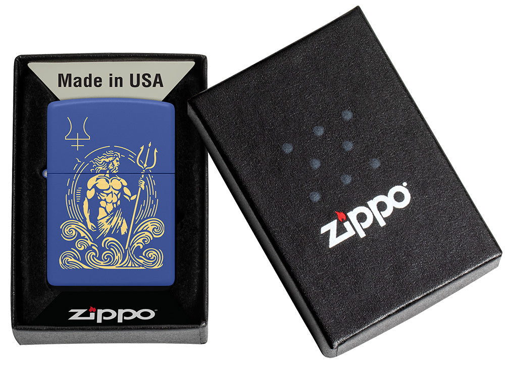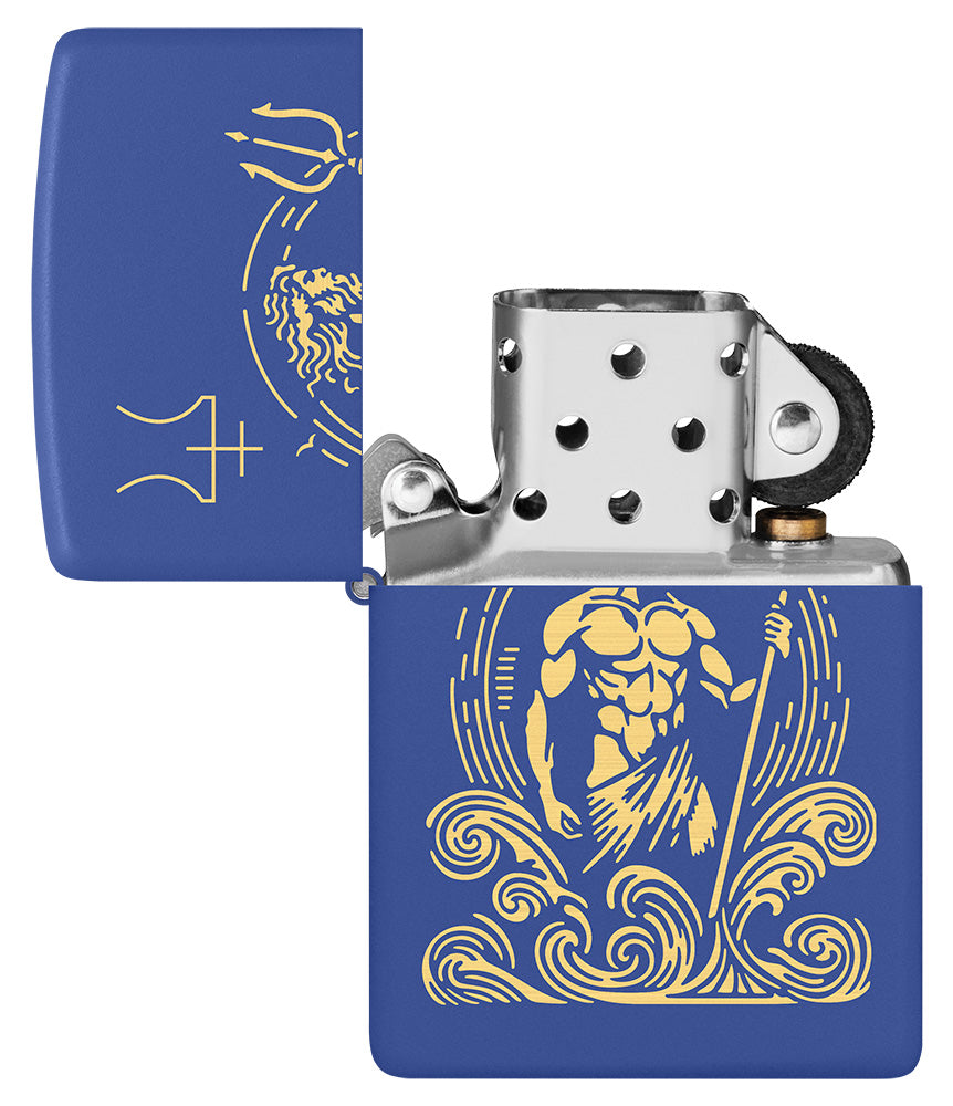 Omringd door hoge golven en gewapend met zijn kenmerkende drietand heerst de Romeinse god Neptunus over de zeeën op deze klassieke Royal Blue Matte aansteker in een schitterende Laser Engrave design.