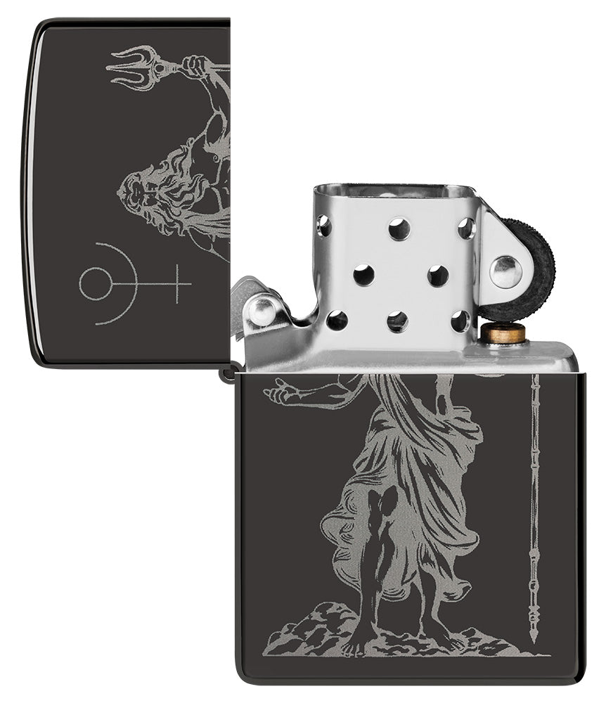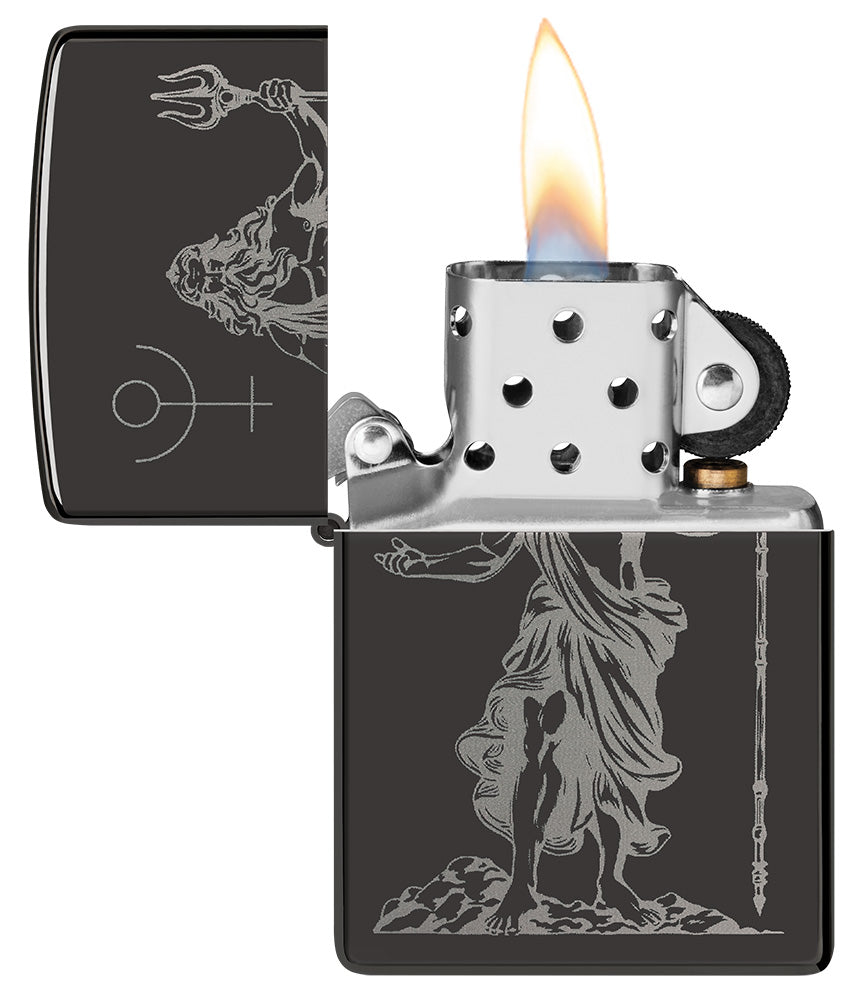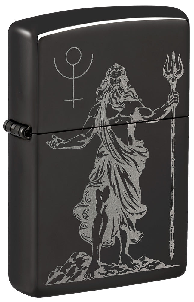 Omringd door hoge golven en gewapend met zijn kenmerkende drietand heerst de Romeinse god Neptunus over de zeeën op deze klassieke Royal Blue Matte aansteker in een schitterende Laser Engrave design.
