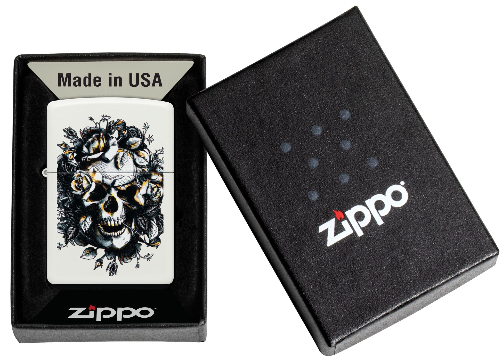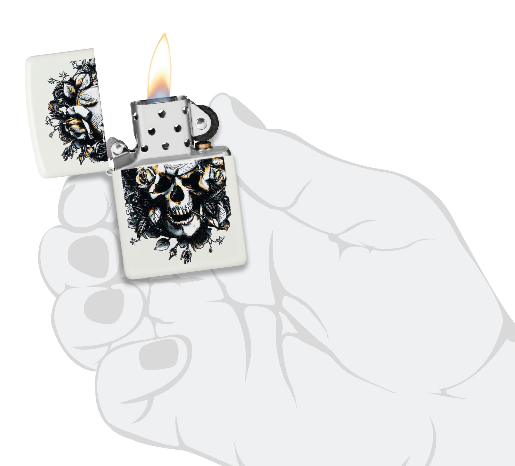 Omringd door verfijnde bloemen, grijnst een tandenskelet vanaf het oppervlak van deze klassieke White Matte aansteker. Het Color Image-ontwerp bevat vakkundig gemaakte schaduwen en gouden accenten voor extra diepte.