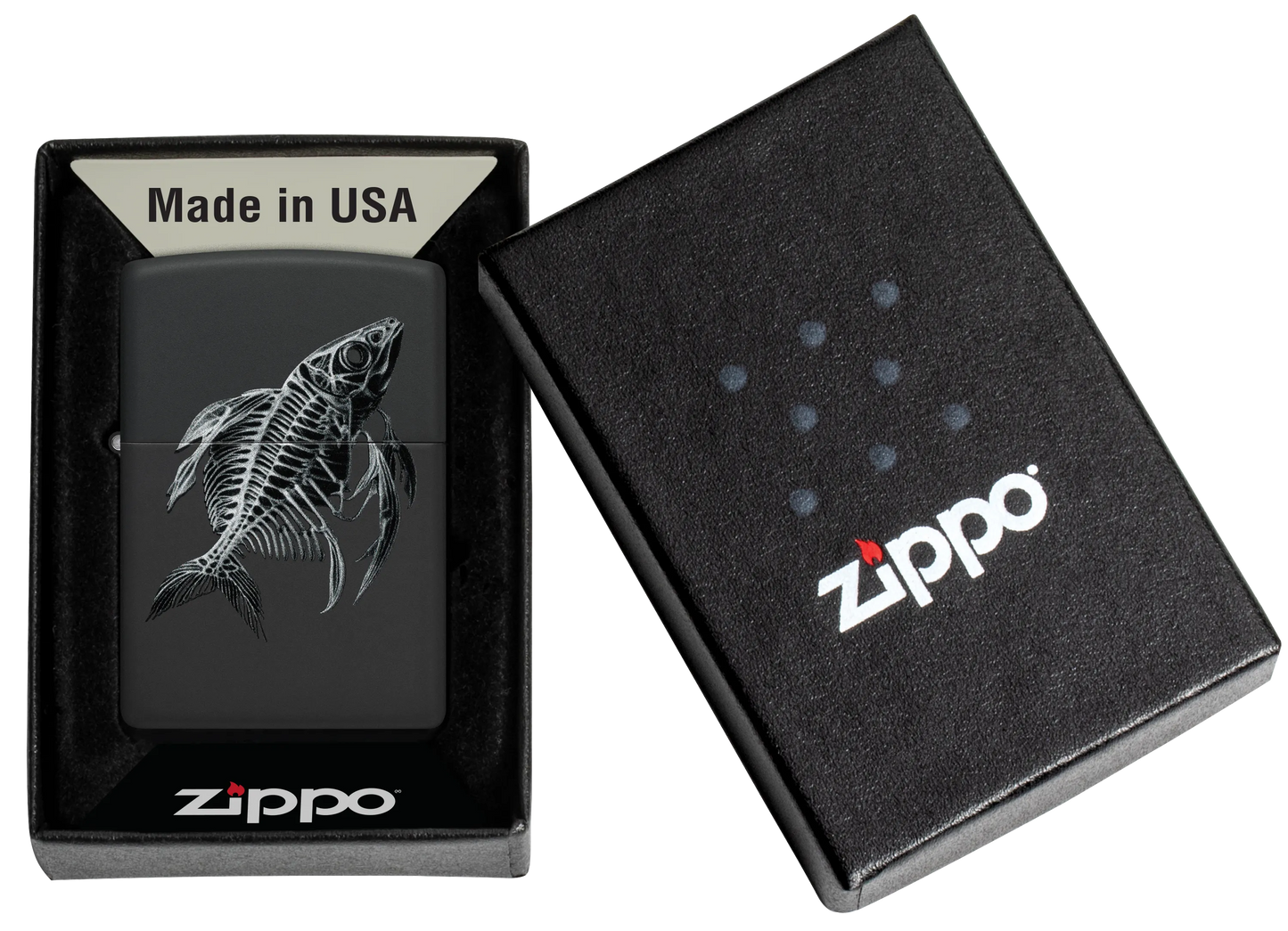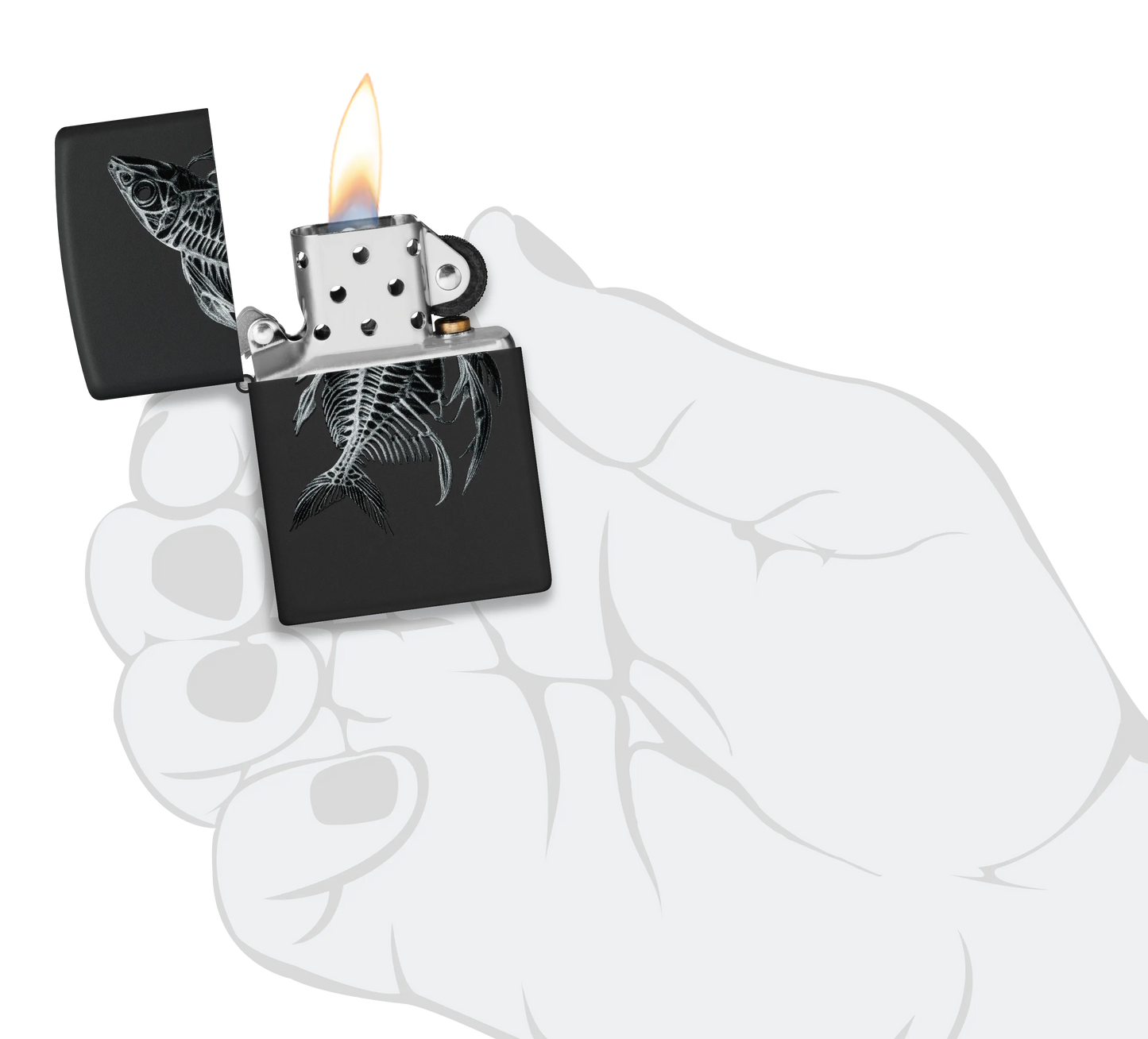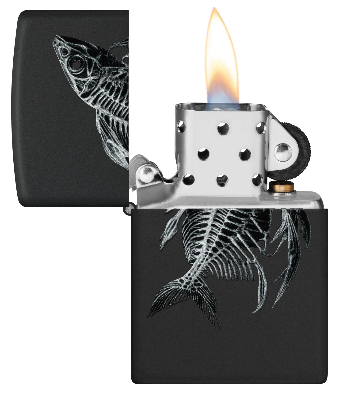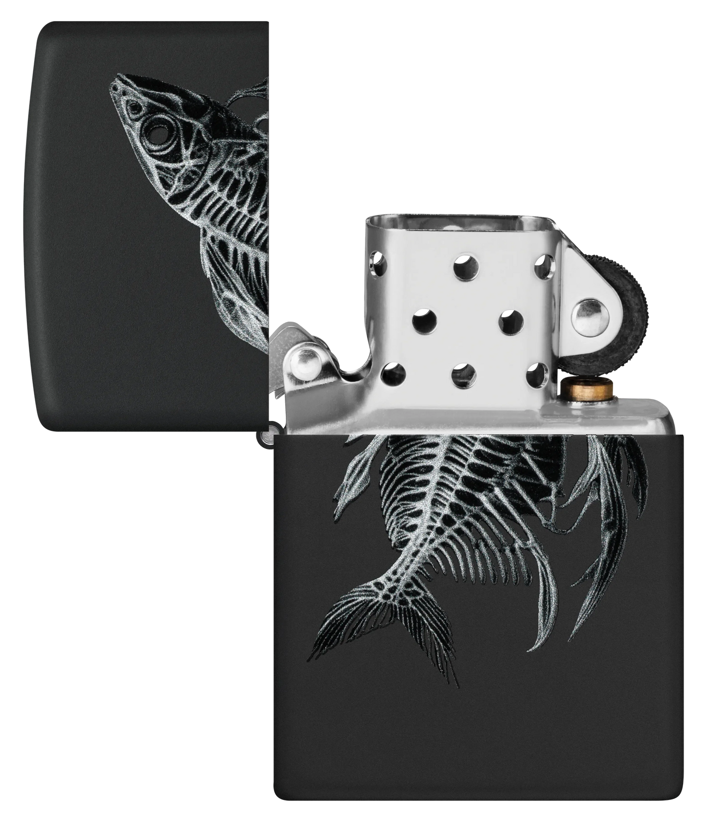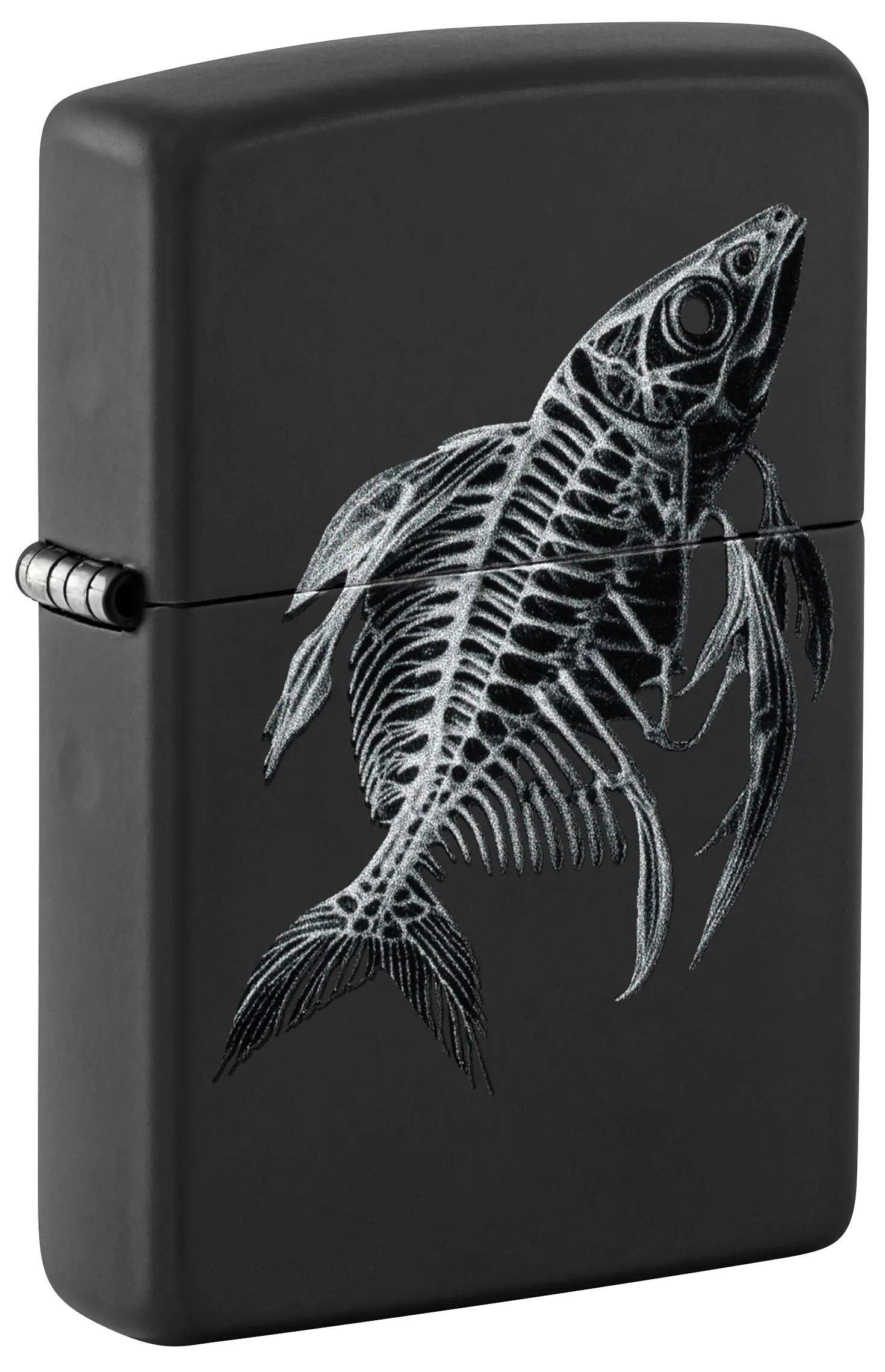 Een fijn gedetailleerd visskelet wikkelt zich om deze klassieke Black Matte aansteker in een spookachtig Color Image design.