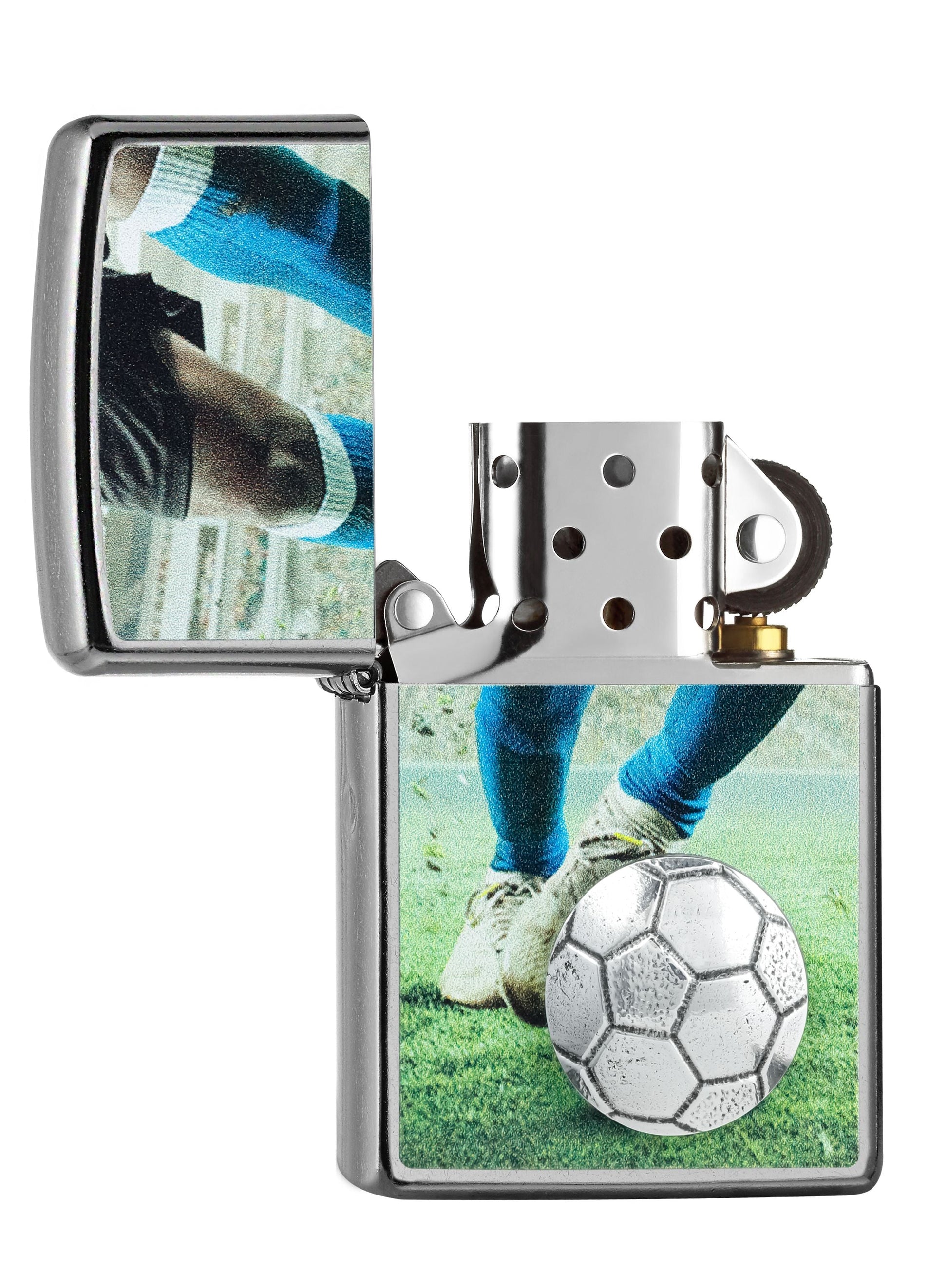 Deze klassieke Satin Chrome aansteker is perfect voor elke voetbalfan en heeft een levendig Color Image-ontwerp van een voetballer en is voorzien van een metalen voetbalembleem voor een driedimensionaal effect.