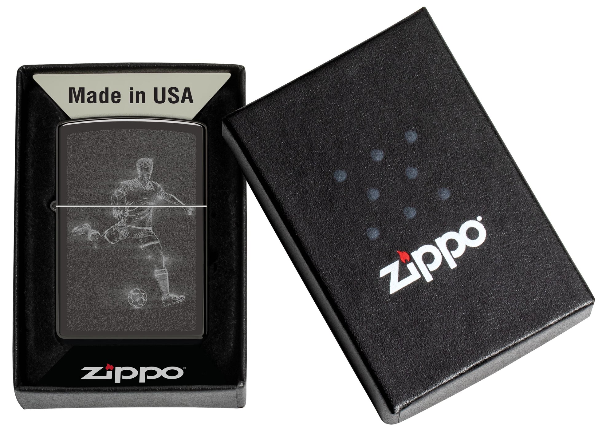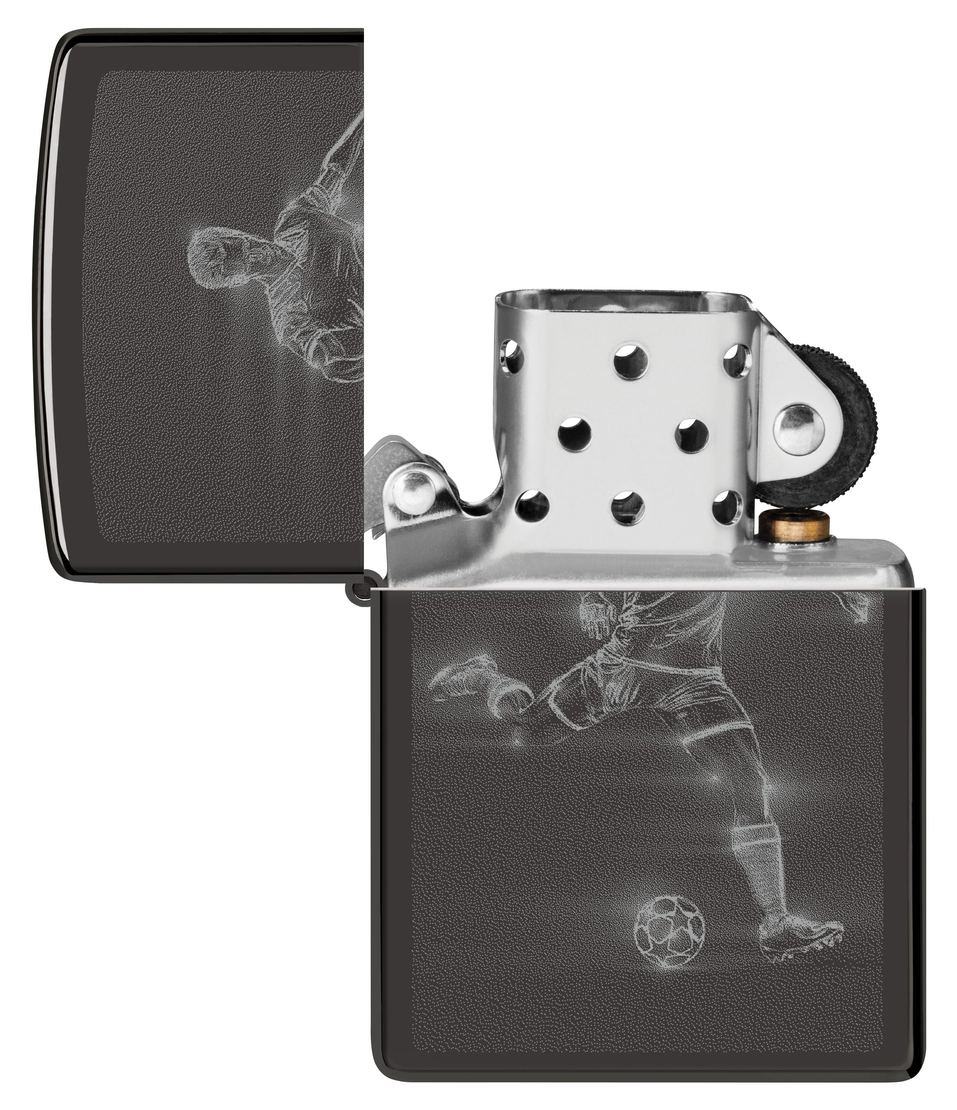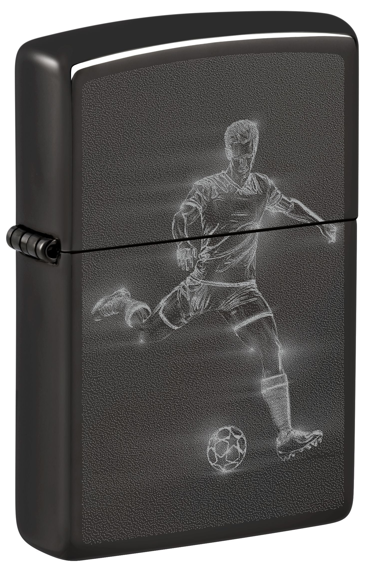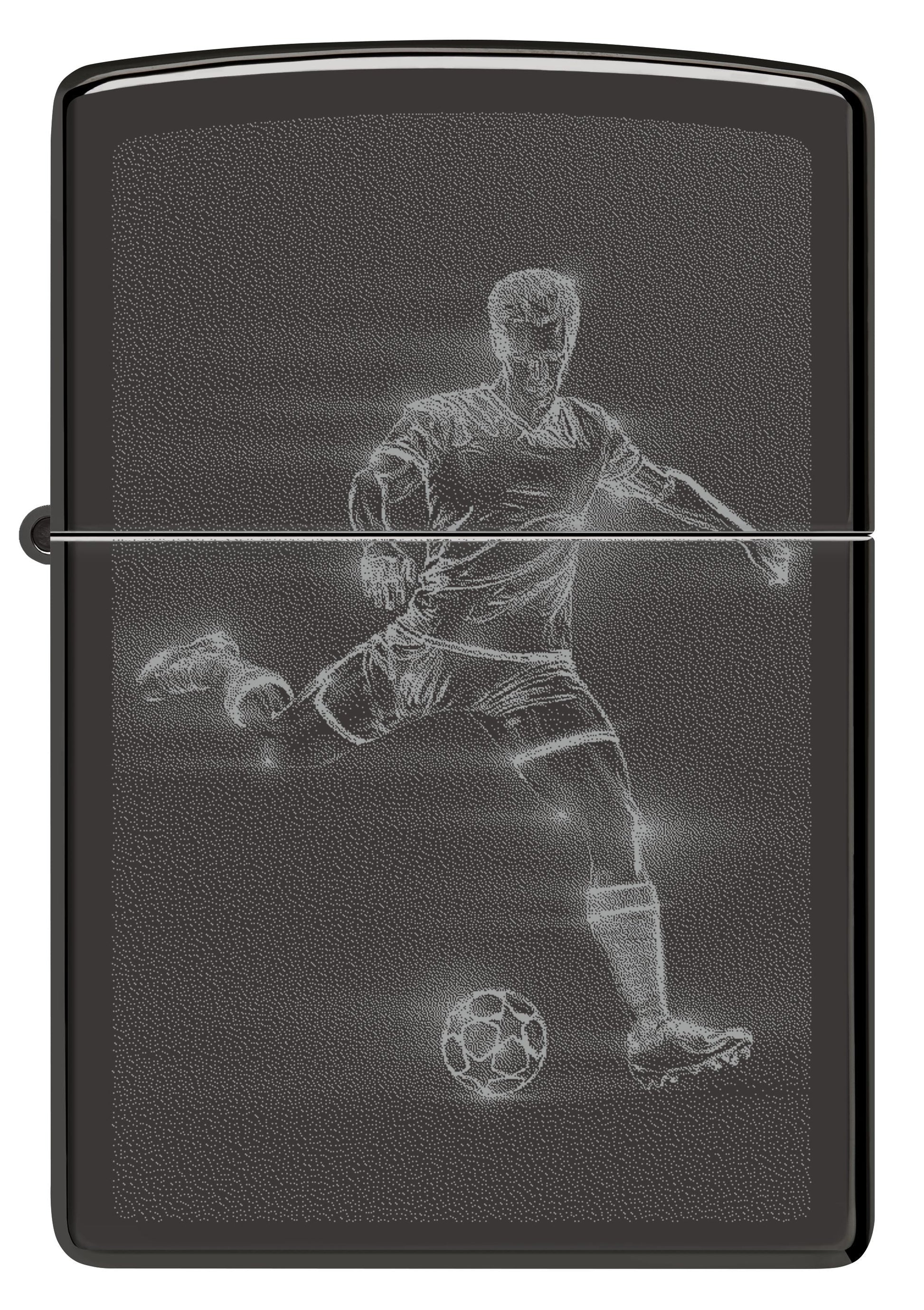 Een voetballer bereidt zich voor op een snelle en krachtige trap met deze klassieke High Polish Black aansteker in een rokerig Photo Image-ontwerp.