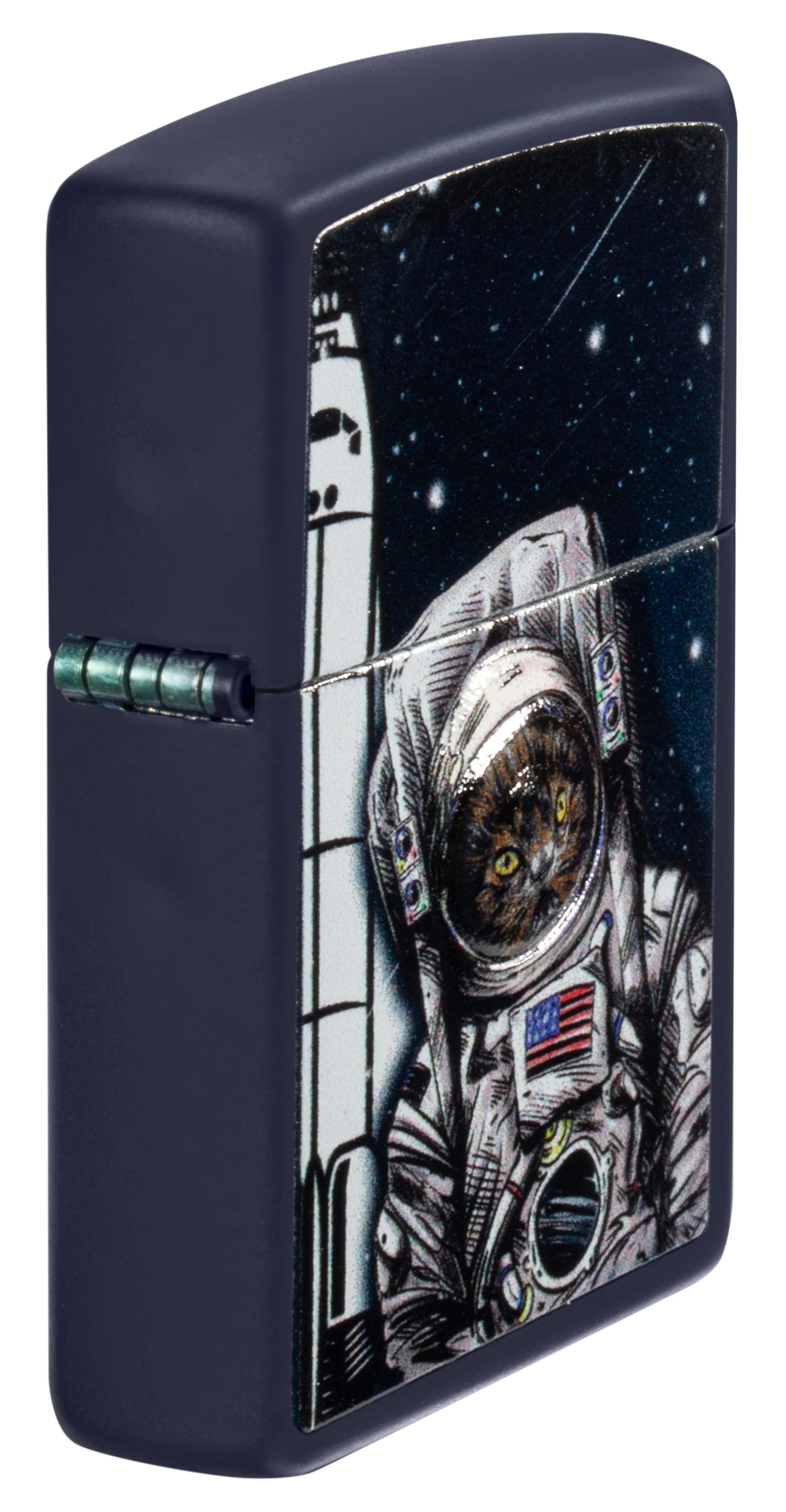 Groeten uit de ruimte! Op deze klassieke Navy Matte aansteker staat een onverschrokken katachtige astronaut op een intergalactische missie, gemaakt met ons kleurenbeeld en textuurdrukproces.