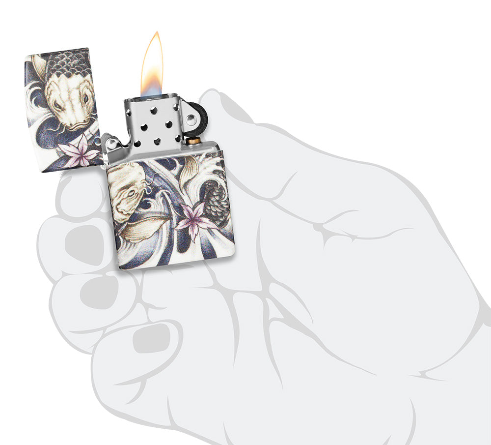 Een sierlijk paar koivissen wervelt rond alle kanten van deze prachtige tattoo-geïnspireerde aansteker. Of u nu wordt aangetrokken door hun symboliek of gewoon door hun schoonheid, dit 540° Color Image-motief legt de beweging en het detail van de koi perfect vast in een rustgevend, gedempt kleurenpalet.