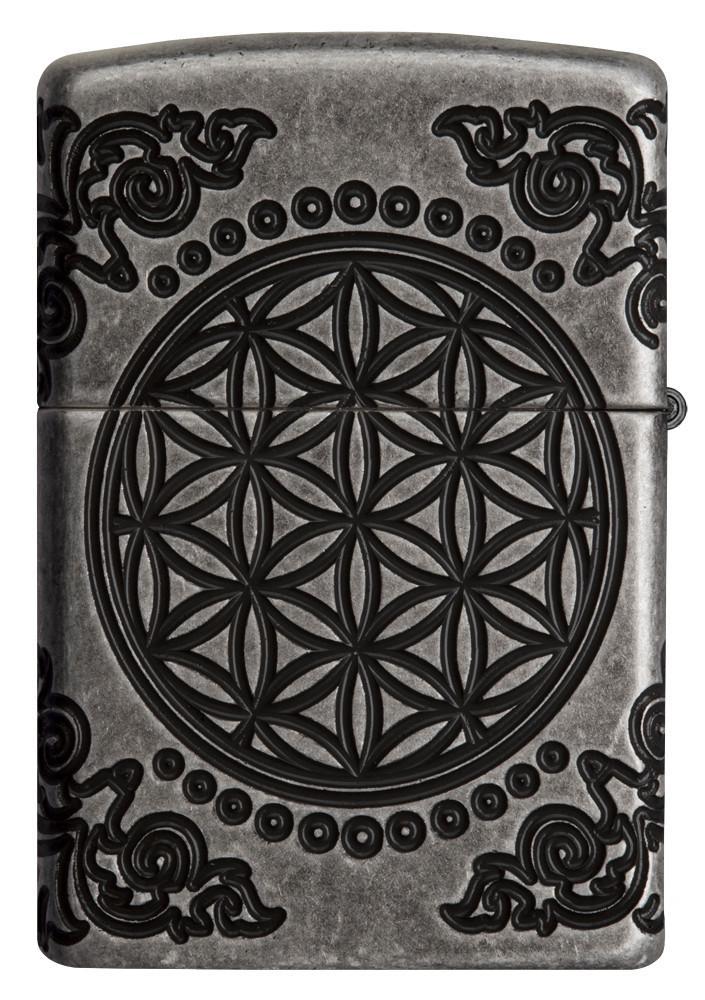Dit harmonieuze Multi Cut-ontwerp op een Armor® Antique Silver-aansteker toont de levensboom, die alle levende wezens uit het verleden, het heden en de toekomst met de aarde verbindt. De levensbloem, een van de vroegste voorbeelden van heilige geometrie, symboliseert de eeuwige verbinding tussen ruimte en tijd en is afgebeeld op de achterkant van deze aansteker. De luxe verpakking toont hoe de hoekelementen, die zijn geïnspireerd op Art Nouveau, de zijkanten van de aansteker overlappen, waardoor de details van deze aansteker beter te zien zijn. Vul de aansteker met Zippo-aanstekervloeistof voor optimale prestaties.