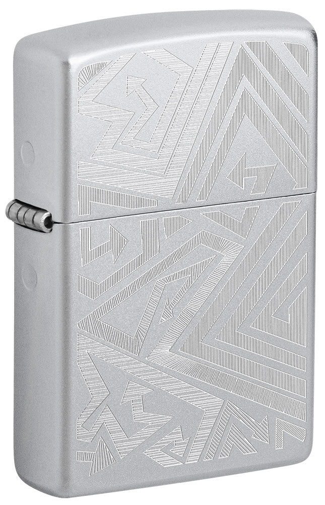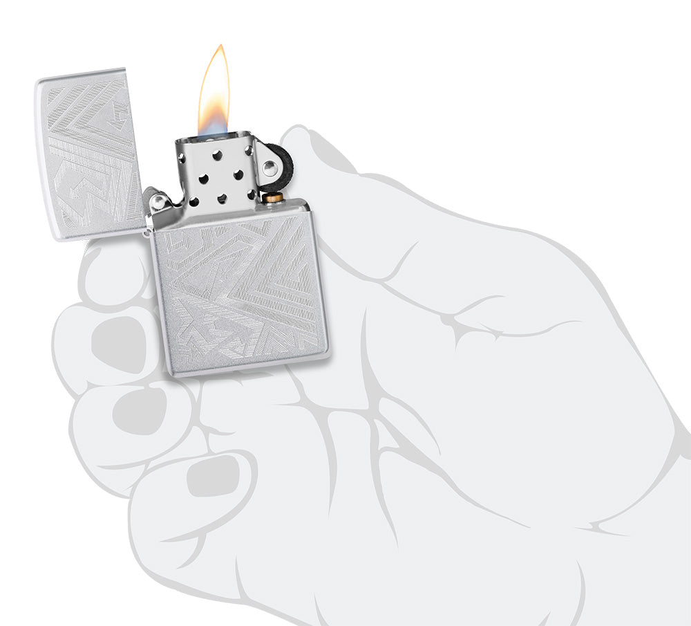 Waar je ook naartoe gaat, deze klassieke Satin Chrome aansteker is klaar om je te vergezellen. Een zwerm pijlen wervelt over het oppervlak in een betoverend Auto Engrave design.