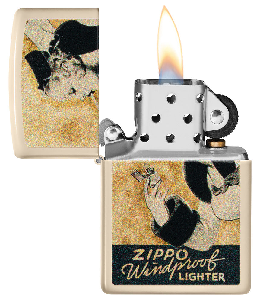 In de stijl van Zippo's eerste nationale reclamecampagne, is dit vintage Color Image motief voorzien van Windy. Het glamoureuze "fan test" reclamemodel, in een stijl die perfect past bij een Flat Sand aansteker.