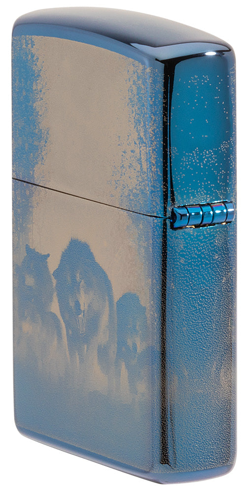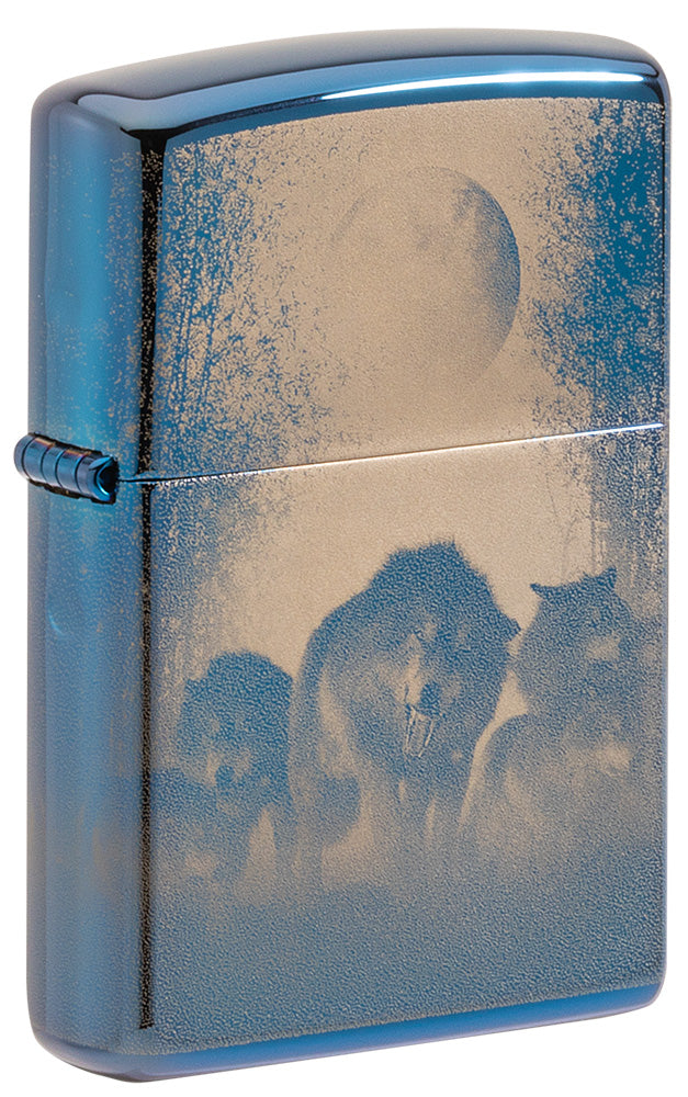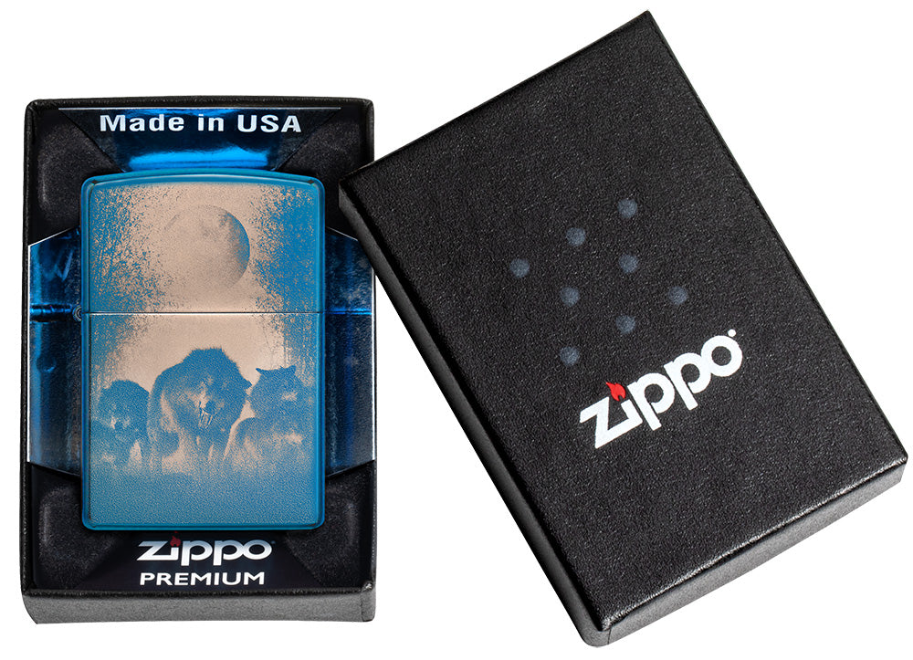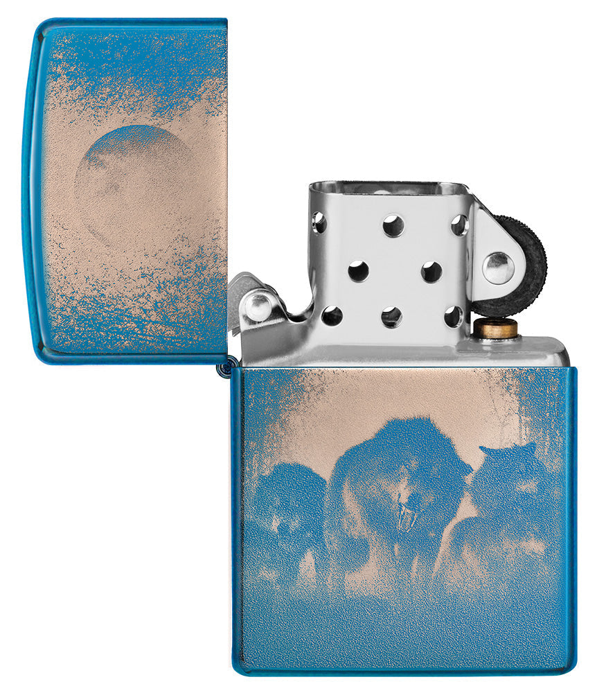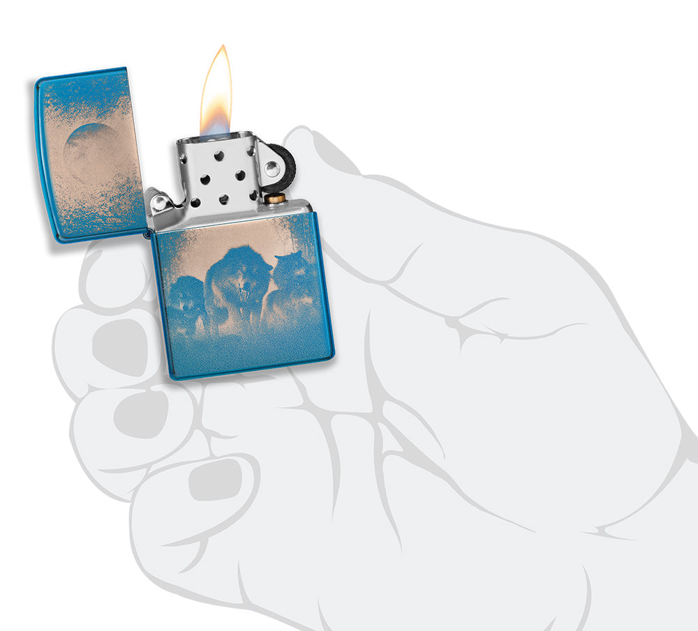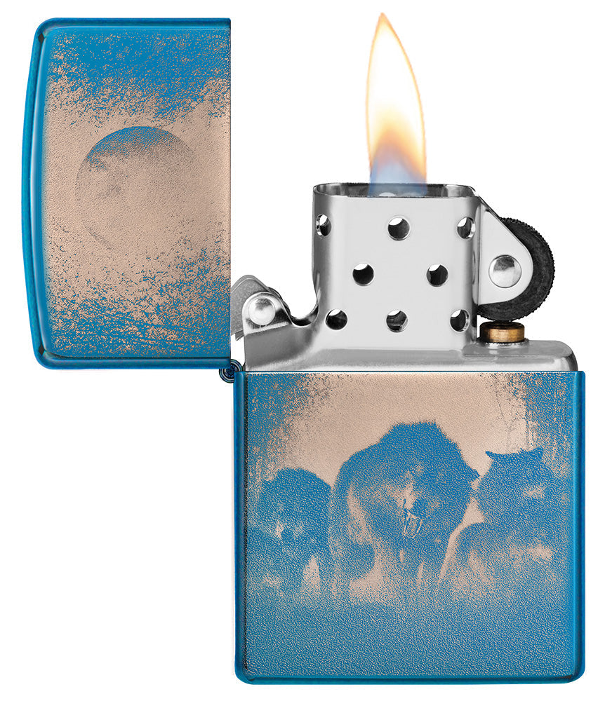 De zeer gepolijste blauwe afwerking geeft de aansteker een stijlvolle en aantrekkelijke uitstraling. De gedetailleerde foto van de wolvenroedel en de volle maan creëert een fascinerende sfeer en vangt de wilde schoonheid van de natuur.