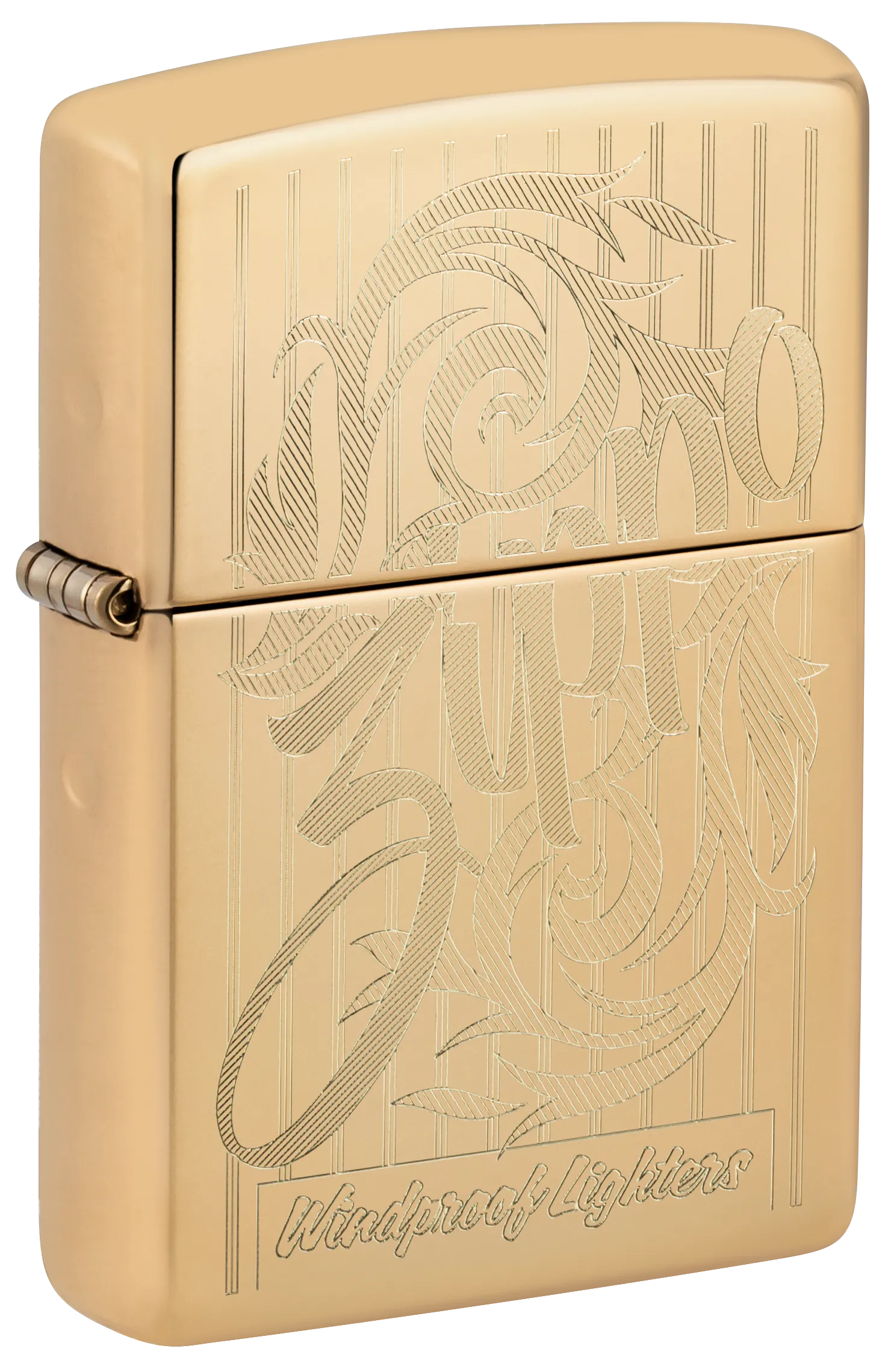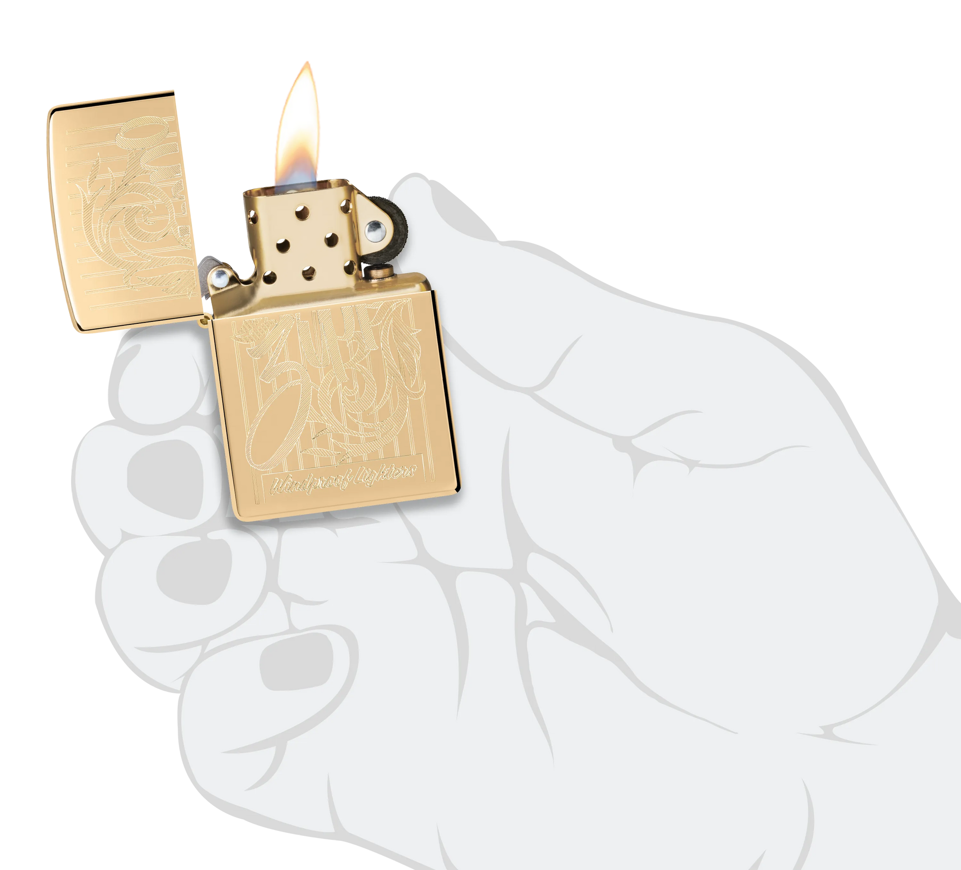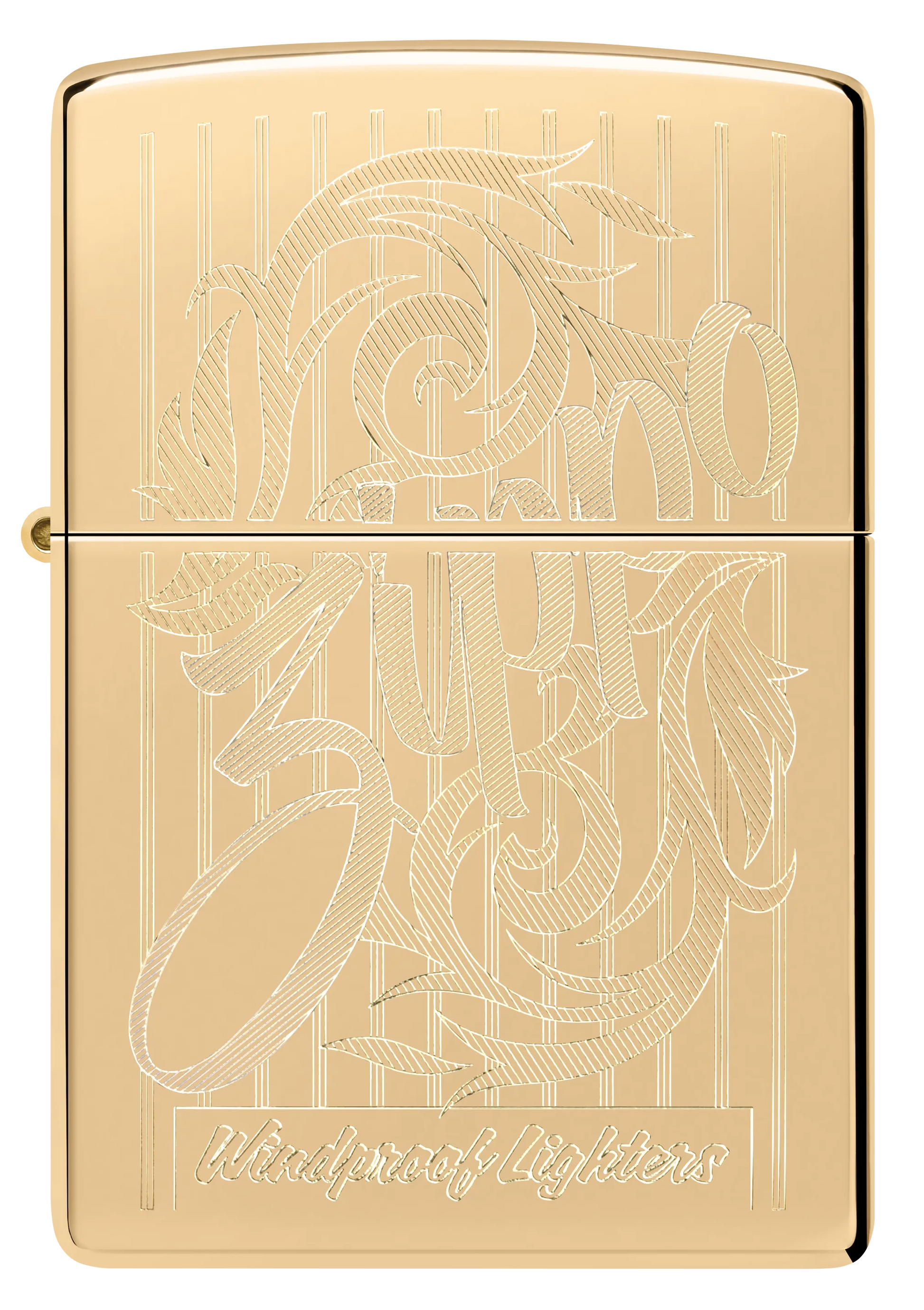 Omringd door dansend filigrein staat de tekst Zippo in een bloemrijk lettertype vermeld op deze klassieke High Polish Brass aansteker in een elegant Auto Engrave design.