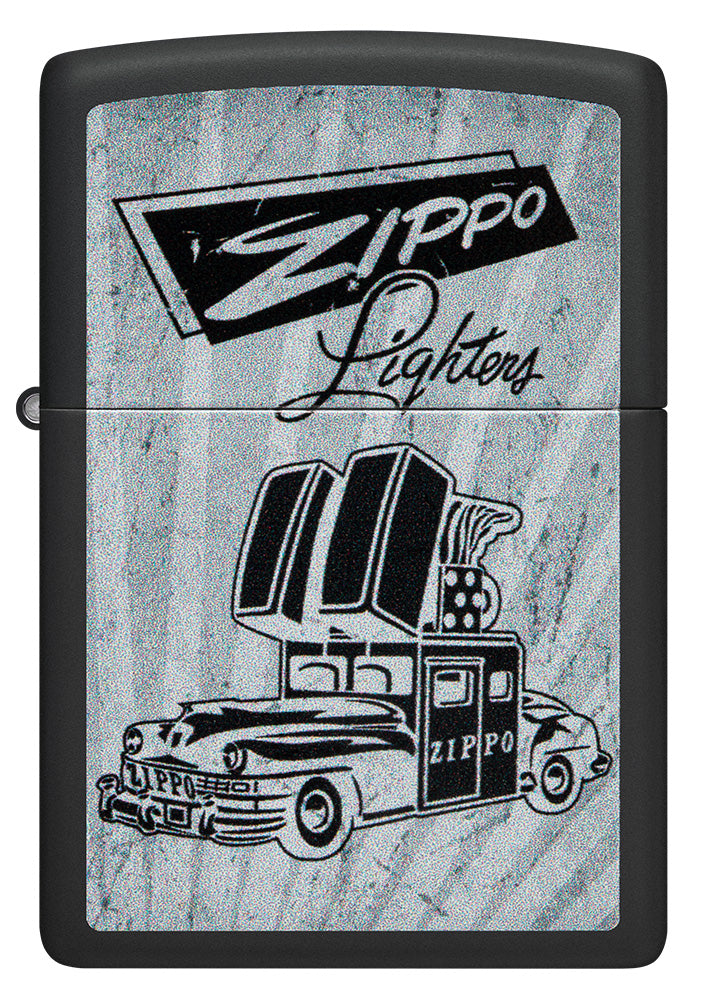 Dit retro-geïnspireerde design komt goed tot zijn recht op een Black Matte aansteker. De iconische Zippo-auto verankert het vintage Zippo-logo met het monochrome Color Image-design.
