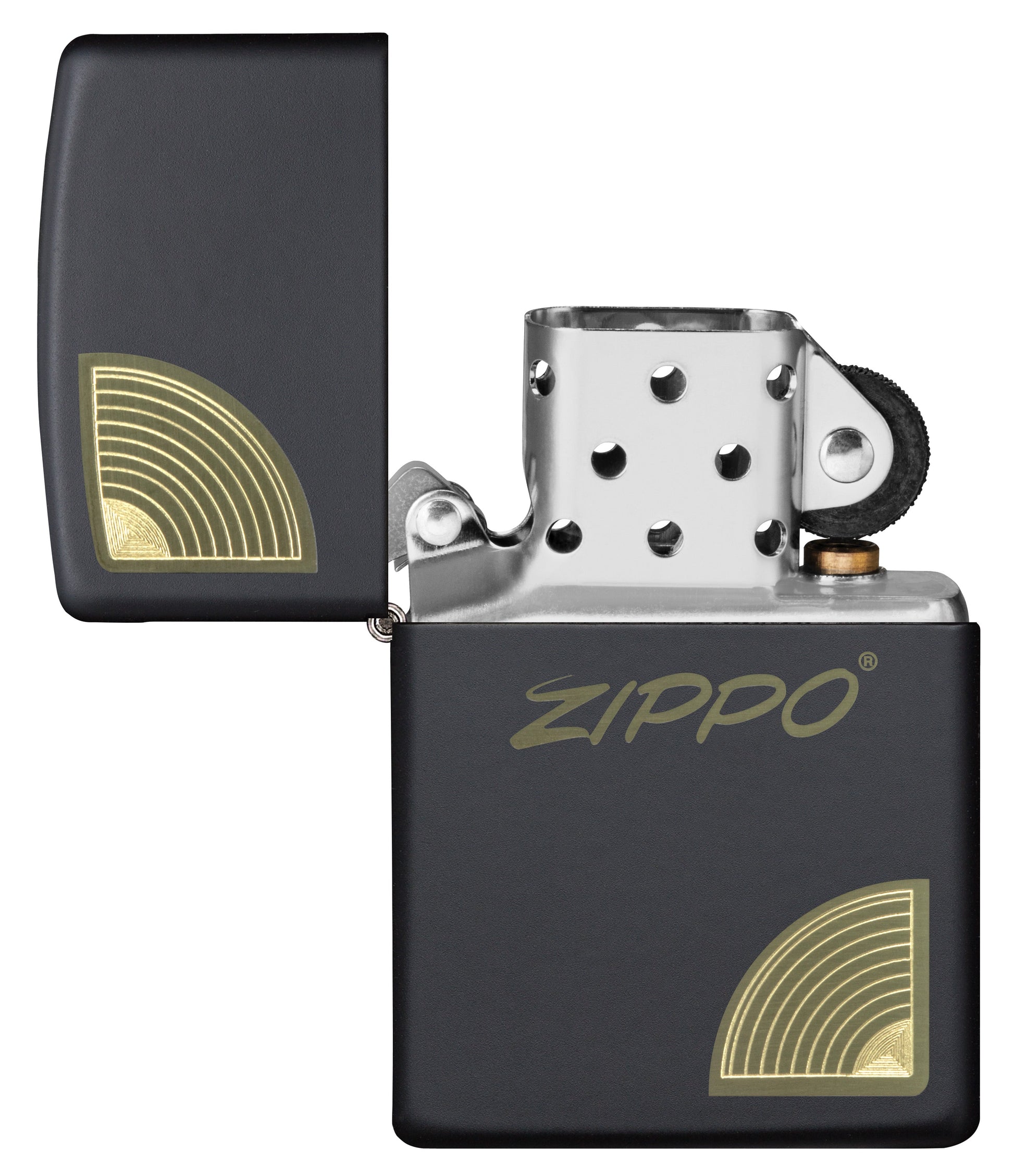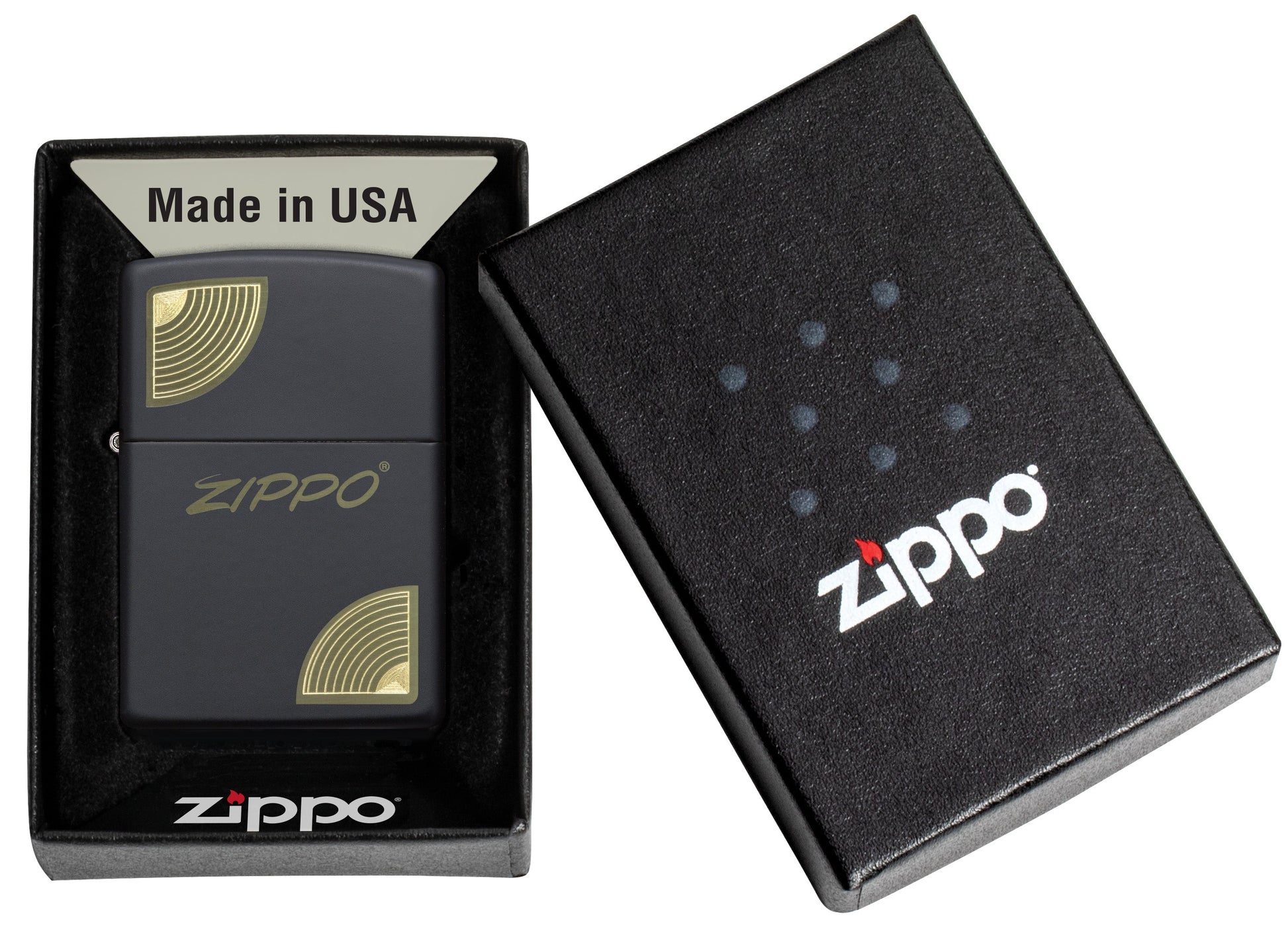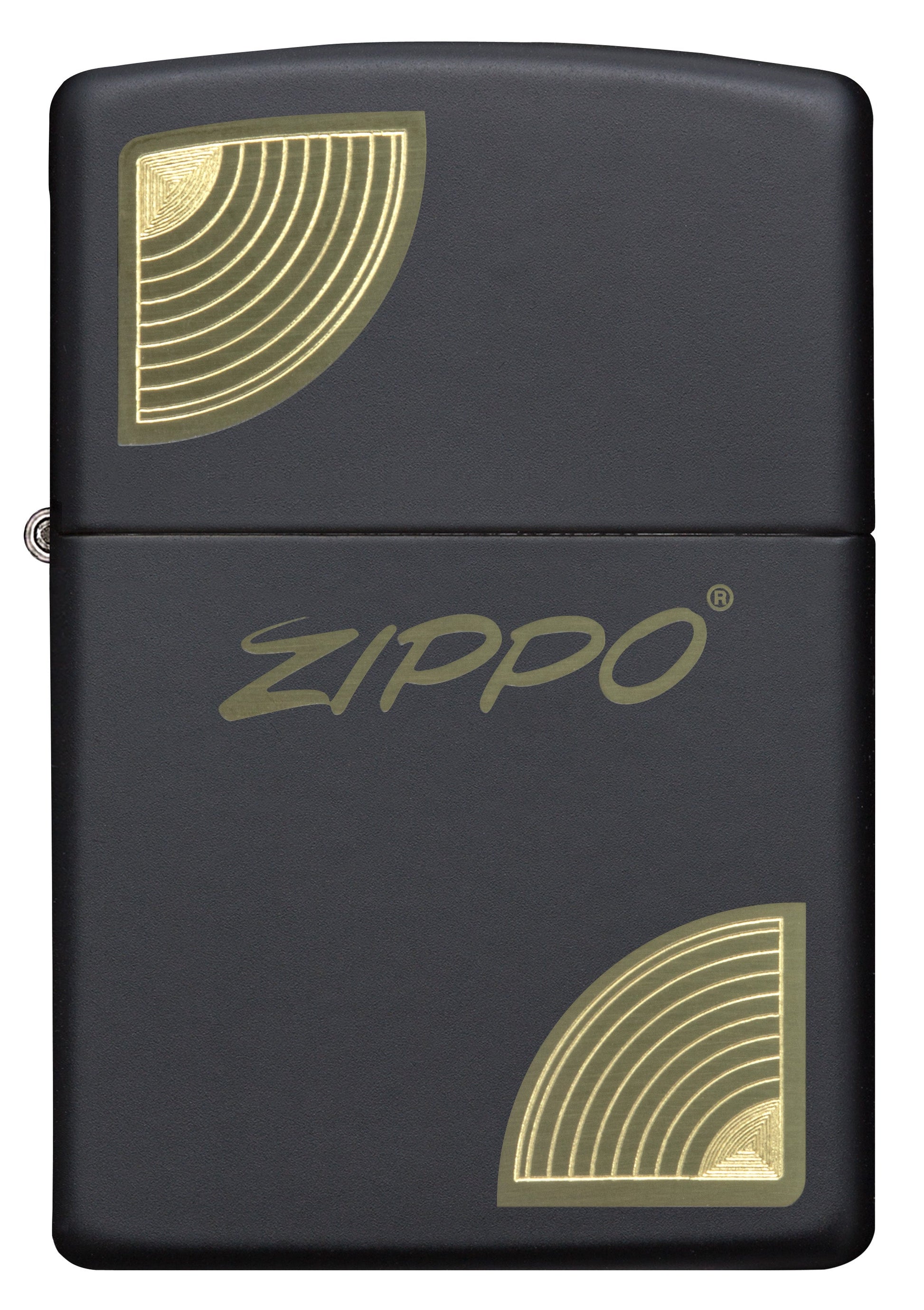 Mit unseren Verfahren Lasergravur und Autogravur wird ein klassisches Zippo-Logo an den Ecken durch einen einfachen, geschwungenen Rand auf diesem klassischen, mattschwarzen Feuerzeug verankert.